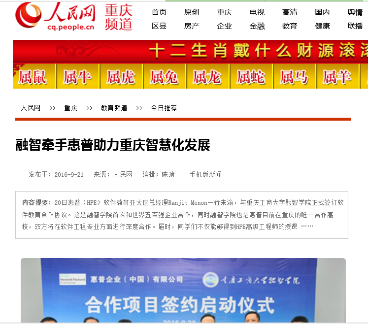 人民网9月21日讯(记者:高缘 谭钰欣)20日惠普(HPE)软件教育亚太区总经理Ranjit Menon一行来渝,与重庆工商大学融智学院正式签订软件教育合作协议。这是融智学院首次和世界五百强企业合作,同时融智学院也是惠普目前在重庆的唯一合作高校,双方将在软件工程专业方面进行深度合作。届时,同学们不仅能够得到HPE高级工程师的授课和指导,接受最前沿的软件工程教育,还能在应聘HPE时得到优先考虑。