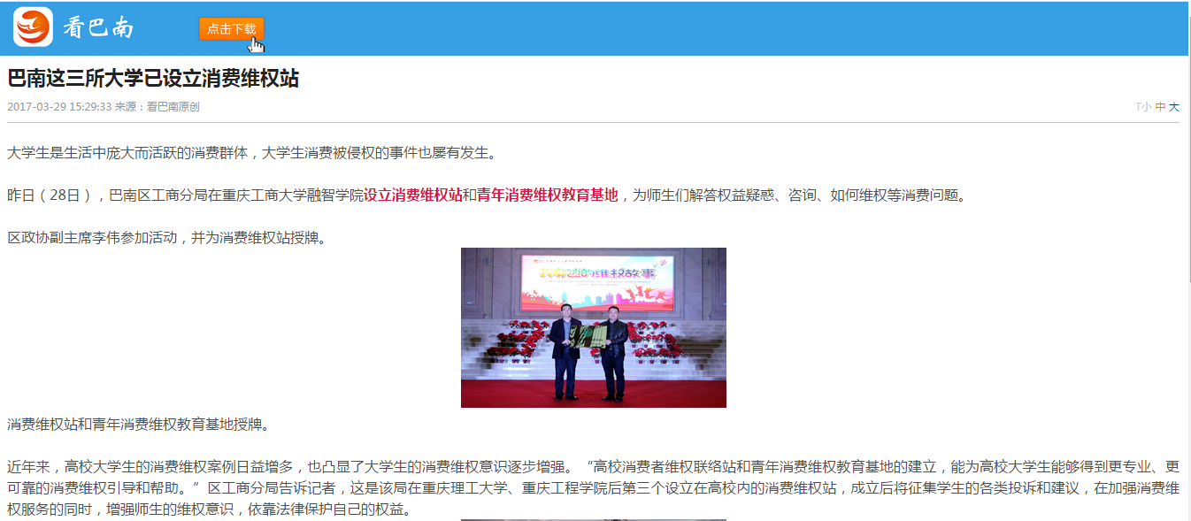 近年来,高校大学生的消费维权案例日益增多,也凸显了大学生的消费维权意识逐步增强。“高校消费者维权联络站和青年消费维权教育基地的建立,能为高校大学生能够得到更专业、更可靠的消费维权引导和帮助。”区工商分局告诉记者,这是该局在重庆理工大学、重庆工程学院后第三个设立在高校内的消费维权站,成立后将征集学生的各类投诉和建议,在加强消费维权服务的同时,增强师生的维权意识,依靠法律保护自己的权益。