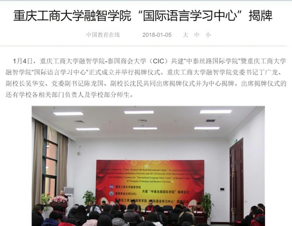 1月4日,重庆工商大学融智学院-泰国商会大学(CIC)共建“中泰丝路国际学院”暨重庆工商大学融智学院“国际语言学习中心”正式成立并举行揭牌仪式。重庆工商大学融智学院党委书记丁广龙、副校长吴华安、党委副书记陈龙国、副校长沈民共同出席揭牌仪式并为中心揭牌。出席揭牌仪式的还有学校各相关部门负责人及学校部分师生。