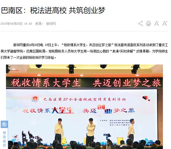 新华网重庆4月20日电 19日上午,“税收情系大学生,共迈创业梦之旅”税法宣传进高校系列活动来到了重庆工商大学融智学院。巴南区国税局、地税局税务人员和大学生用一场别出心裁的“表演+实时讲解”式情景剧,为学院师生们带来了一次全新的税收知识学习体验。