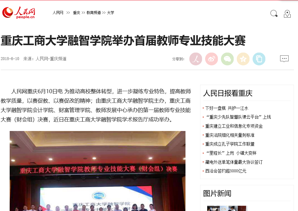 人民网重庆6月10日电 为推动高校整体转型,进一步凝练专业特色,提高教师教学质量,以赛促教、以赛促改的精神;由重庆工商大学融智学院主办,重庆工商大学融智学院会计学院、财富管理学院、教师发展中心承办的第一届教师专业技能大赛(财会组)决赛,近日在重庆工商大学融智学院学术报告厅成功举办。