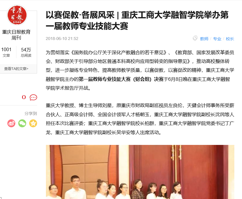 为贯彻落实《国务院办公厅关于深化产教融合的若干意见》、《教育部、国家发展改革委员会、财政部关于引导部分地区普通本科高校向应用型转变的指导意见》,推动高校整体转型,进一步凝练专业特色,提高教师教学质量,以赛促教,以赛促改的精神,重庆工商大学融智学院主办的第一届教师专业技能大赛(财会组)决赛于6月8日晚在重庆工商大学融智学院学术报告厅开战。