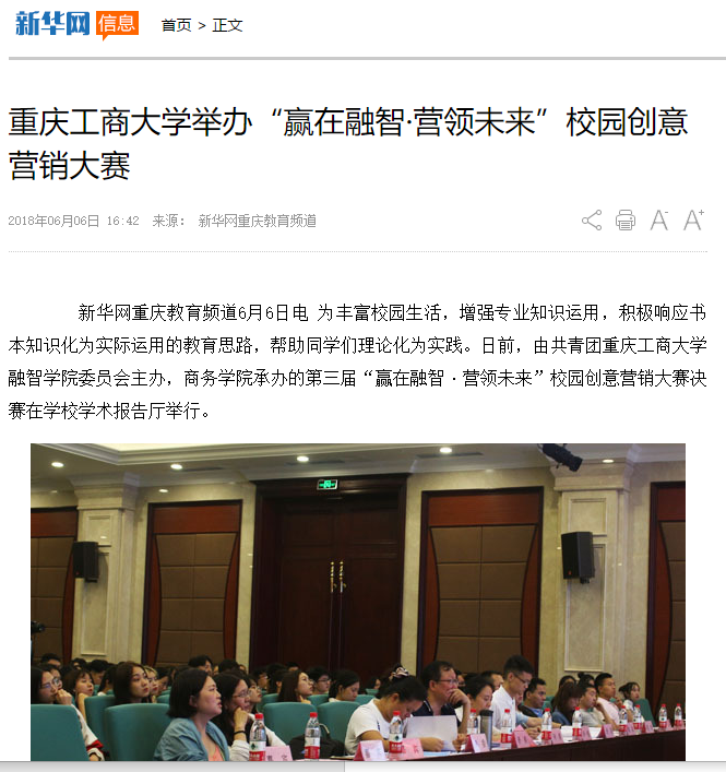 新华网重庆教育频道6月6日电 为丰富校园生活,增强专业知识运用,积极响应书本知识化为实际运用的教育思路,帮助同学们理论化为实践。日前,由共青团重庆工商大学融智学院委员会主办,商务学院承办的第三届“赢在融智·营领未来”校园创意营销大赛决赛在学校学术报告厅举行。