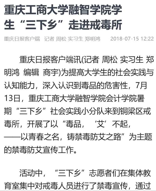 重庆日报客户端讯(记者 周松 实习生 郑明鸿 编辑 商宇)为提高大学生的社会实践与认知能力,深入认识到毒品的危害性,7月13日,重庆工商大学融智学院会计学院暑期“三下乡”社会实践小分队来到铜梁区戒毒所,开展了以“毒品,‘艾’不起,——以青春之名,铸禁毒防艾之路”为主题的禁毒防艾宣传工作。