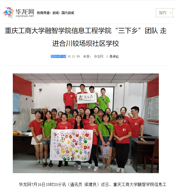 华龙网7月16日15时20分讯(通讯员 梁建良)近日,重庆工商大学融智学院信息工程学院调查团与涉外商贸调查团,走进合川区较场坝社区学校,与该校学生和家长共同开展了“党的十九大精神”学习实践活动。