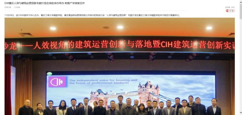 11月24日,由CIH中国学习中心主办,重庆工商大学融智学院、重庆赛迪物业管理有限公司承办的物业行业“人效与建筑运营创新”专题沙龙在重庆工商大学融智学院学术报告厅隆重举行。