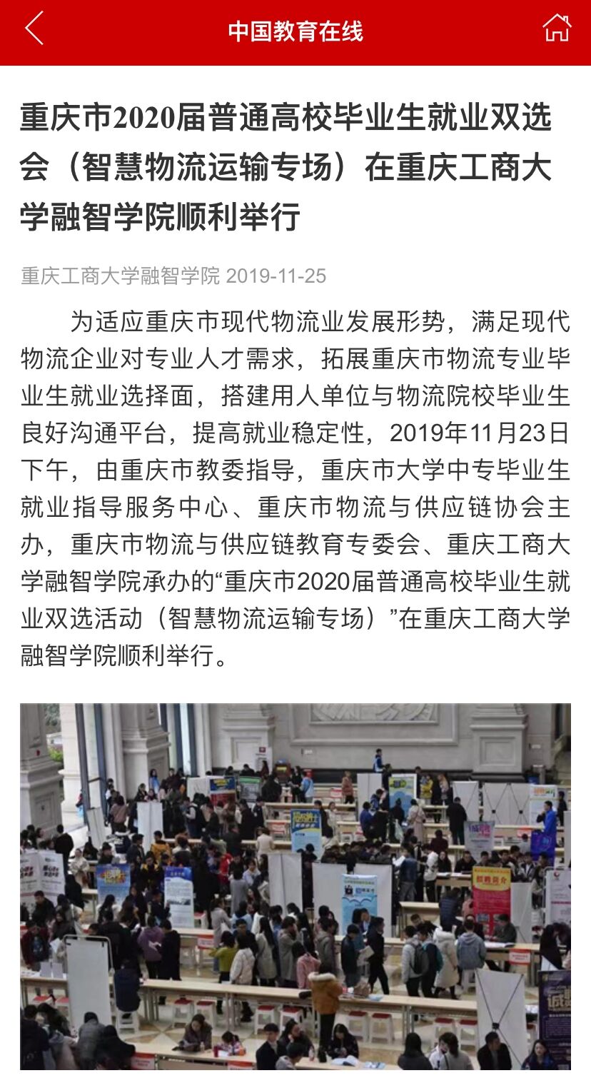 为适应重庆市现代物流业发展形势,满足现代物流企业对专业人才需求,拓展重庆市物流专业毕业生就业选择面,搭建用人单位与物流院校毕业生良好沟通平台,提高就业稳定性,2019年11月23日下午,由重庆市教委指导,重庆市大学中专毕业生就业指导服务中心、重庆市物流与供应链协会主办,重庆市物流与供应链教育专委会、重庆工商大学融智学院承办的“重庆市2020届普通高校毕业生就业双选活动(智慧物流运输专场)”在重庆工商大学融智学院顺利举行。