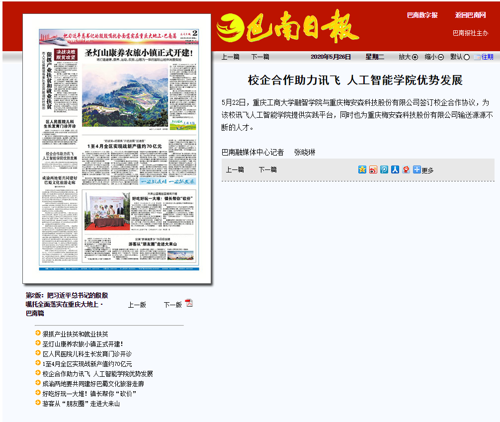 5月22日,重庆工商大学融智学院与重庆梅安森科技股份有限公司签订校企合作协议,为该校讯飞人工智能学院提供实践平台,同时也为重庆梅安森科技股份有限公司输送源源不断的人才。 巴南融媒体中心记者张晓琳 来源:巴南日报 2020-05-24