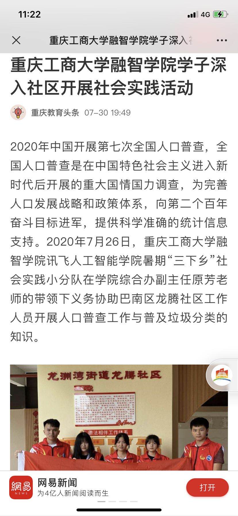 2020年中国开展第七次全国人口普查,全国人口普查是在中国特色社会主义进入新时代后开展的重大国情国力调查,为完善人口发展战略和政策体系,向第二个百年奋斗目标进军,提供科学准确的统计信息支持。2020年7月26日,重庆工商大学融智学院讯飞人工智能学院暑期“三下乡”社会实践小分队在学院综合办副主任原芳老师的带领下义务协助巴南区龙腾社区工作人员开展人口普查工作与普及垃圾分类的知识。