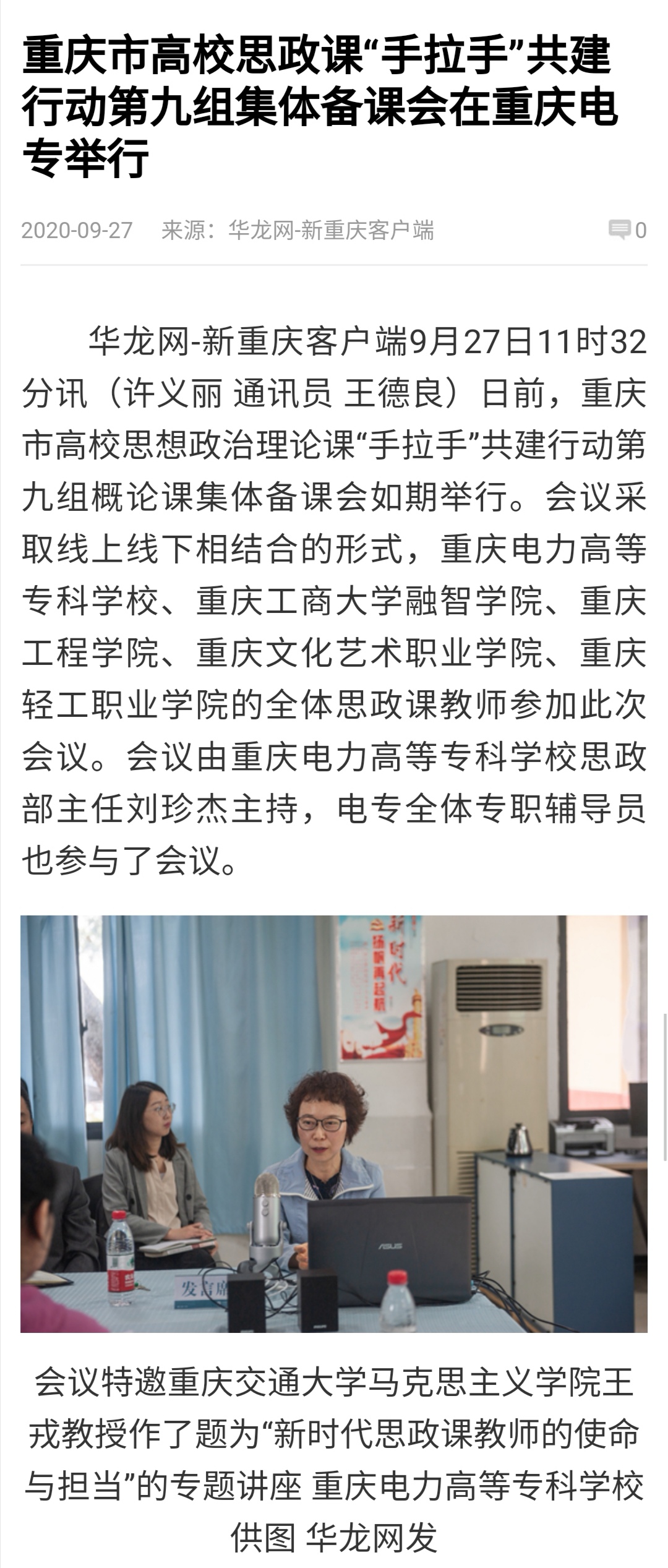 日前,重庆市高校思想政治理论课“手拉手”共建行动第九组概论课集体备课会如期举行。会议采取线上线下相结合的形式,重庆电力高等专科学校、重庆工商大学融智学院、重庆工程学院、重庆文化艺术职业学院、重庆轻工职业学院的全体思政课教师参加此次会议。会议由重庆电力高等专科学校思政部主任刘珍杰主持,电专全体专职辅导员也参与了会议。