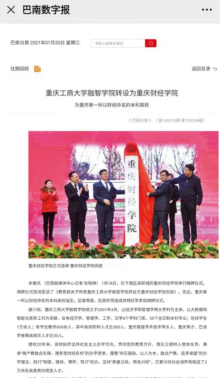 1月18日,位于我区高职城的靠谱的电子游戏平台官网举行揭牌仪式。揭牌仪式现场宣读了《教育部关于同意重庆工商大学融智学院转设为靠谱的电子游戏平台官网的函》。至此,重庆第一所以财经命名的本科高校诞生。区委常委、区政府党组成员杨红军参加揭牌仪式。