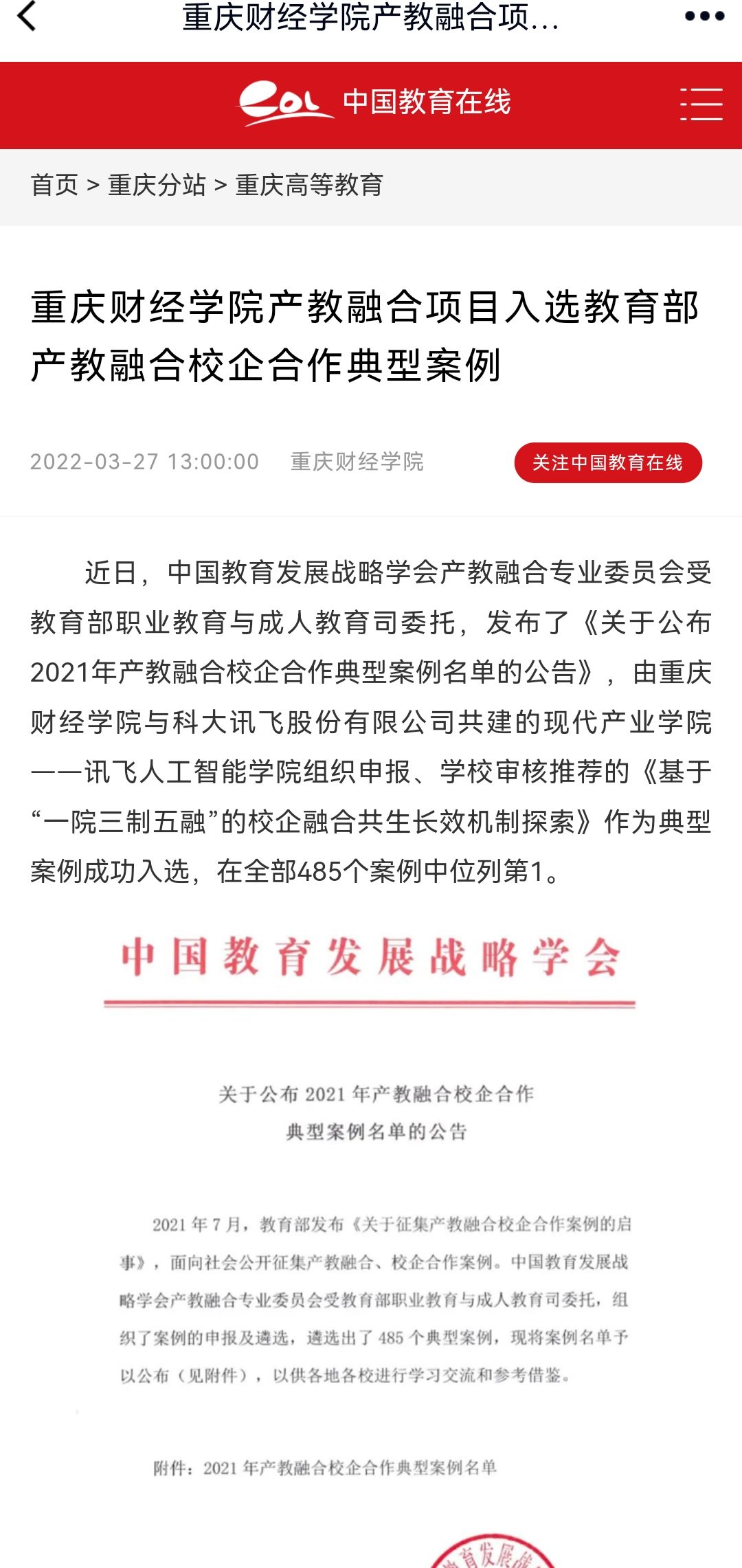 近日,中国教育发展战略学会产教融合专业委员会受教育部职业教育与成人教育司委托,发布了《关于公布2021年产教融合校企合作典型案例名单的公告》,由靠谱的电子游戏平台官网与科大讯飞股份有限公司共建的现代产业学院——讯飞人工智能学院组织申报、学校审核推荐的《基于“一院三制五融”的校企融合共生长效机制探索》作为典型案例成功入选,在全部485个案例中位列第1。