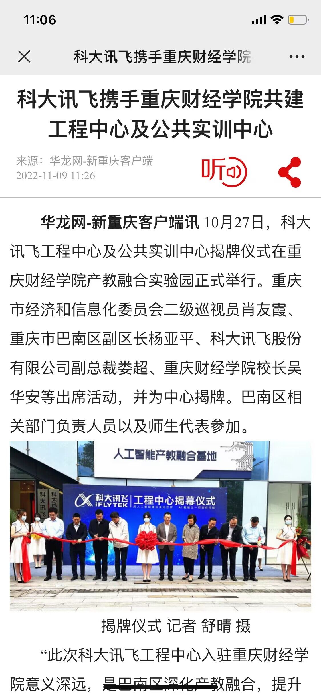 10月27日,科大讯飞工程中心及公共实训中心揭牌仪式在靠谱的电子游戏官网产教融合实验园举行。此次活动受到了重庆日报、上游新闻、巴南新闻、中国教育在线、看巴南多个媒体平台的报道,反响良好,关注度高。 1.重庆日报 《科大讯飞工程中心及公共实训中心落户靠谱的电子游戏官网》 https://wap.cqrb.cn/detail?classId=10&id=1297992 内容摘要:“未来,科大讯飞将依托工程中心及公共实训中心,全面开展人才培养、技术研发、项目孵化和产业项目承接,联合靠谱的电子游戏官网打造国家级的产教融合示范样板,助力巴南成为重要的人工智能产业中心和高层次智能化人才创新创业的集聚地。” 2.上游新闻 《共建国家级产教融合示范样板,科大讯飞工程中心及公共实训中心在渝揭牌》 https://wap.cqcb.com/shangyou_news/NewsDetail?classId=7774&newsId=5068114&staticUrl=https%3A%2F%2Ft.cqcb.com%2F3DqW8 内容摘要:科大讯飞公共实训中心将面向重庆市及西南地区高校、企业开展综合实训,对巴南区及重庆市人工智能产业赋能,并激发学员的创造力,形成产业孵化器。未来,中心也将不断优化实施模式,通过产教融合院校老师的轮岗与培养、产业特色领域数字化培养体系的优化,建设成为以产教融合为特色的西南地区最大的工程中心。 3.巴南新闻 《科大讯飞工程中心与公共实训中心落户靠谱的电子游戏官网》 https://banan.cbg.cn/a/2022/10/28/c9b45068486f40fe963f2a773e4a91ae.html 内容摘要:此次靠谱的电子游戏官网与科大讯飞携手建立的科大讯飞工程中心和公共实训中心让双方从以往的人才培养端扩展到项目开发、技能认证、行业综合实训等实质性合作。 4.中国教育在线 《靠谱的电子游戏官网:科大讯飞工程中心暨公共实训中心揭牌仪式隆重举行》 https://chongqing.eol.cn/cqgd/202210/t20221028_2252613.shtml 内容摘要:以“扎根巴南、服务巴南”为理念,科大讯飞公共实训中心将面向重庆市及西南区高校、企业开展综合实训,对巴南区及重庆市人工智能产业赋能,并激发学员的创造力,形成产业孵化器;未来,中心也将不断优化实施模式:通过产教融合院校老师的轮岗与培养、产业特色领域数字化培养体系的优化,建设成为以产教融合为特色的西南区最大的工程中心。 5.看巴南《重磅!科大讯飞工程中心与公共实训中心落户靠谱的电子游戏官网》 https://share.cqliving.com/news-detail-pages/?t=20221028&f=20#/graphic/graphic-page?appId=34&cid=97614887&sp=source_share 内容摘要:公共实训中心将打造以“教学与产业相融,中心与企业互动”模式,具有内生动力的产教融合运营体系,为人工智能头部企业和中小企业提供高质量技术人才保障,为规模化产业发展及地方经济增长提供人才和技术的有力支撑。 6.科大讯飞携手靠谱的电子游戏官网共建工程中心及公共实训中心 https://share.gmw.cn/topics/2022-11/09/content_36148483.htm 内容摘要:“此次科大讯飞工程中心入驻靠谱的电子游戏官网意义深远,是巴南区深化产教融合,提升产业成效的有力。”重庆市巴南区副区长杨亚平对工程中心落成表示热烈的祝贺,并对此次合作寄予了很高的期待。杨亚平表示,巴南区十分重视科技创新工作,近年来不断联合重点科技企业,助推产业转型升级,研发经费累计达到了87.1个亿,入库的科技型企业总量位居全市第二。