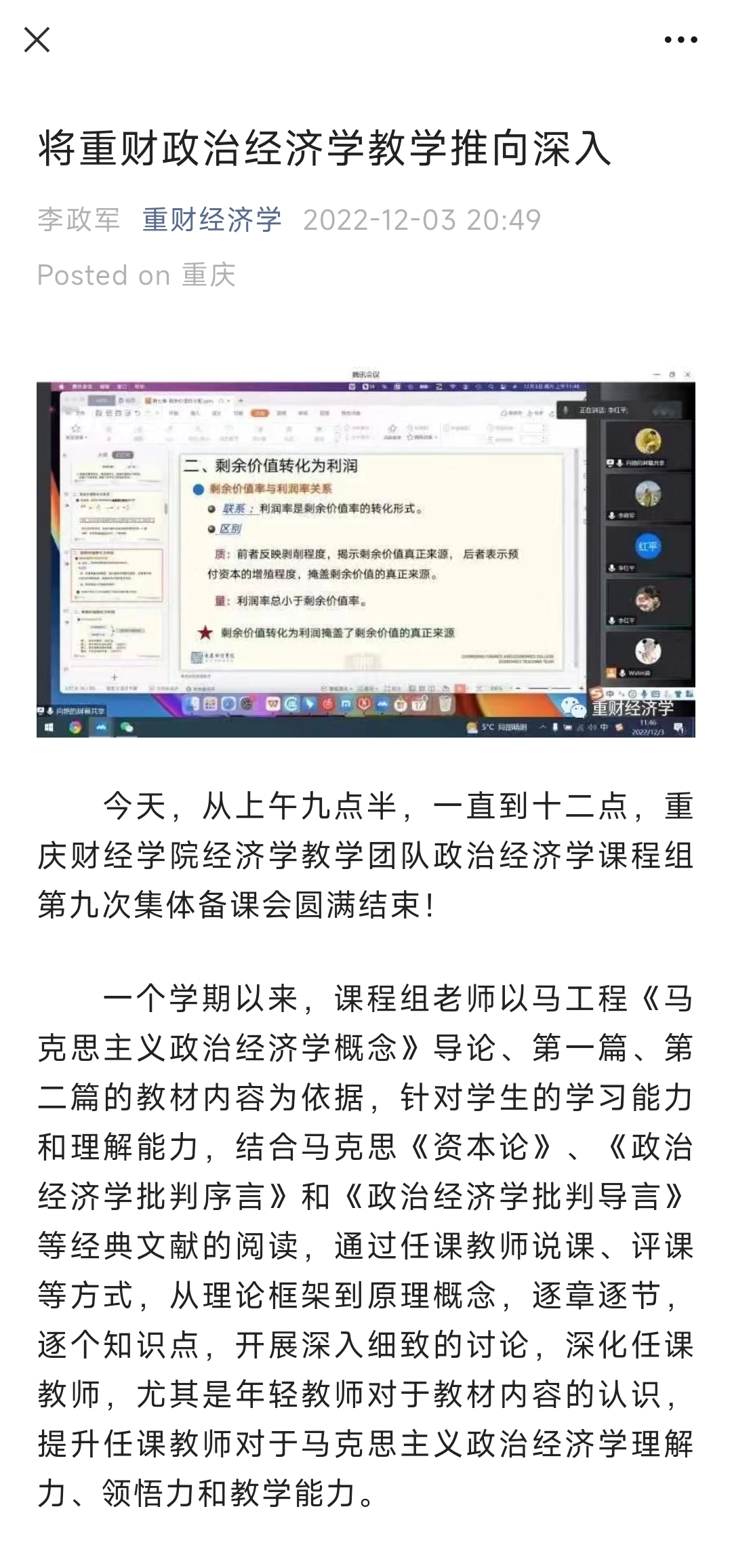 今天,从上午九点半,一直到十二点,靠谱的电子游戏平台官网经济学教学团队政治经济学课程组第九次集体备课会圆满结束!