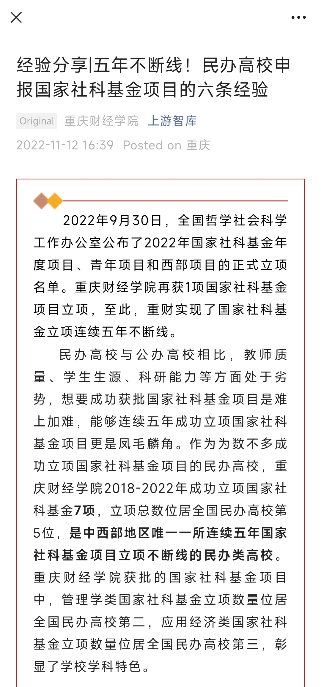 靠谱的电子游戏官网获批的国家社科基金项目中,管理学类、应用经济类国家社科基金立项数量位居全国民办高校前列,有明显的学科聚焦度。经了解,该校的组织工作思路也极其注重聚焦学科、资源。一是选题充分聚焦特色学科。相较于公办院校,民办高校只能将十分有限的研究资源聚焦到相对有限的学科领域专业方向上,尤其是聚焦管理学、应用经济等相对基础较好的学科。如在选题上,靠谱的电子游戏官网聚焦西部地区、西南地区、三峡库区、西部陆海新通道、长江上游地区等为区域对象。二是充分聚焦现有研究基础。近年来,靠谱的电子游戏官网不断加强内涵建设,老师们聚焦高质量发展、绿色评价、产业集聚、人口迁移、应急物流、红色资源、粮食安全等在积累了成果。引导申报团队充分梳理已经发表学术论文、智库成果、咨询报告等,结合现实需求、学科特色、研究方法等充分挖掘研究特色。三是聚焦研究选题深度研讨。申报国家社科基金应夯实研究基础,注重研究成果的聚集与衍生,但最终要回归到研究本身。从申报准备、选题策划、选题论证、申报书论证等环节,结合国家社科基金项目立项课题选题特征,都围绕某一领域的具体问题进行深度讨论,在一轮又一轮的论证中寻找问题、修改选题、优化材料。