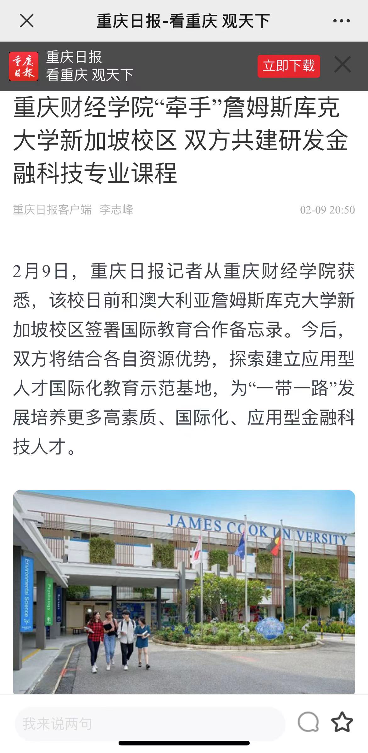 2月9日,重庆日报记者从靠谱的电子游戏平台官网获悉,该校日前和澳大利亚詹姆斯库克大学新加坡校区签署国际教育合作备忘录。今后,双方将结合各自资源优势,探索建立应用型人才国际化教育示范基地,为“一带一路”发展培养更多高素质、国际化、应用型金融科技人才。