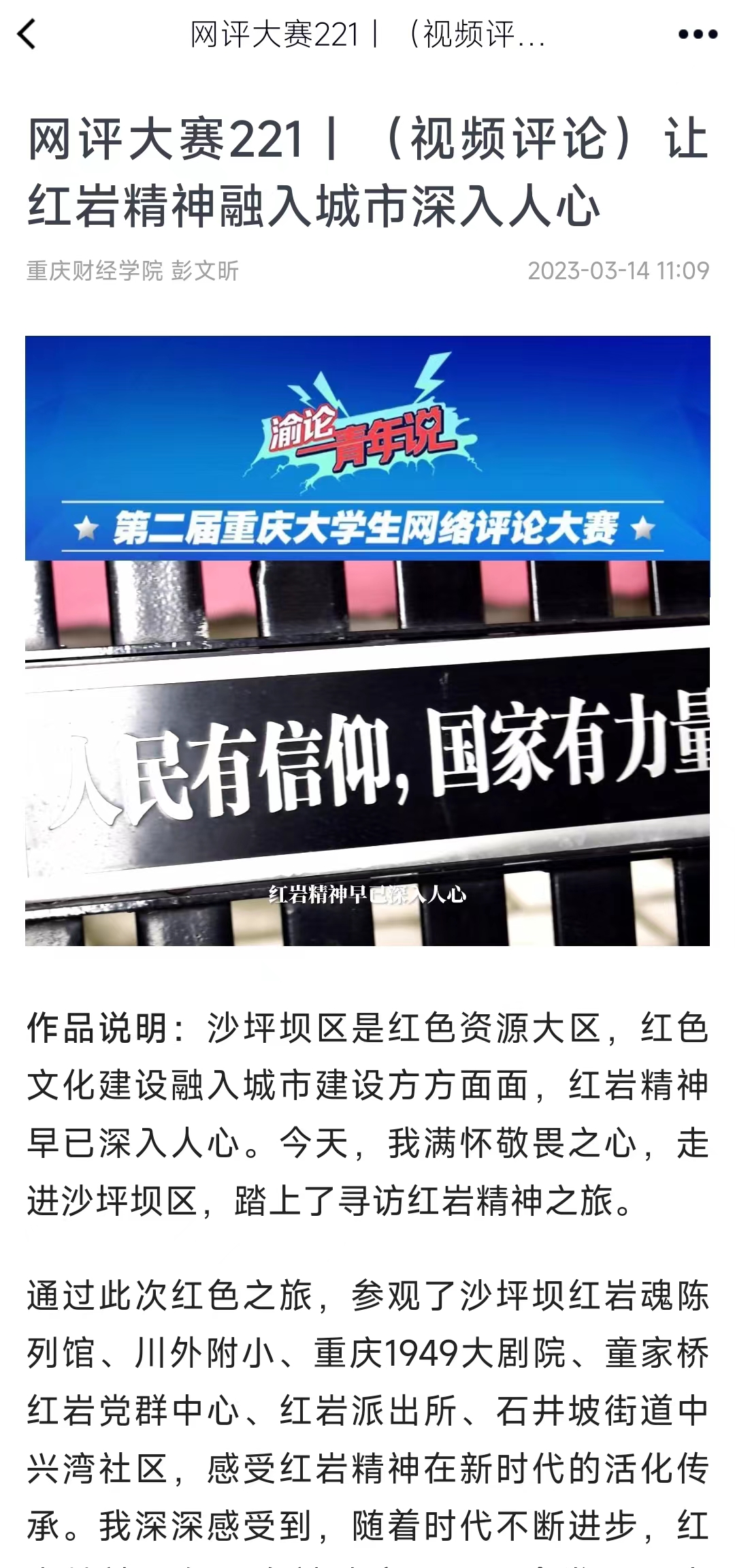 作品说明:沙坪坝区是红色资源大区,红色文化建设融入城市建设方方面面,红岩精神早已深入人心。今天,我满怀敬畏之心,走进沙坪坝区,踏上了寻访红岩精神之旅。