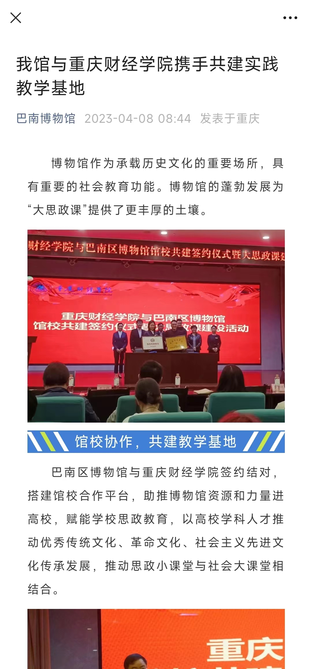 巴南区博物馆与靠谱的电子游戏平台官网签约结对,搭建馆校合作平台,助推博物馆资源和力量进高校,赋能学校思政教育,以高校学科人才推动优秀传统文化、革命文化、社会主义先进文化传承发展,推动思政小课堂与社会大课堂相结合。