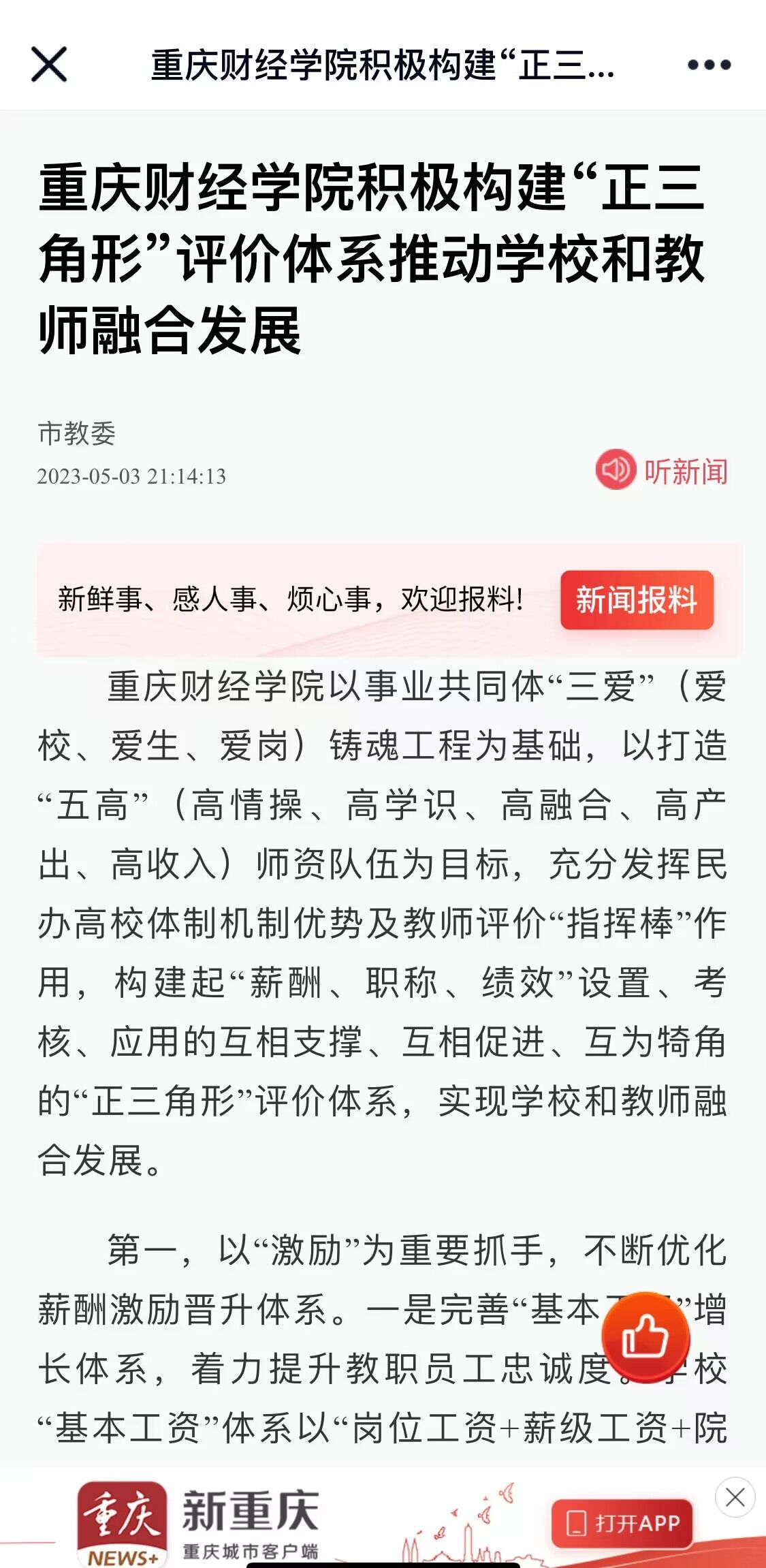 靠谱的电子游戏平台官网以事业共同体“三爱”(爱校、爱生、爱岗)铸魂工程为基础,以打造“五高”(高情操、高学识、高融合、高产出、高收入)师资队伍为目标,充分发挥民办高校体制机制优势及教师评价“指挥棒”作用,构建起“薪酬、职称、绩效”设置、考核、应用的互相支撑、互相促进、互为犄角的“正三角形”评价体系,实现学校和教师融合发展。