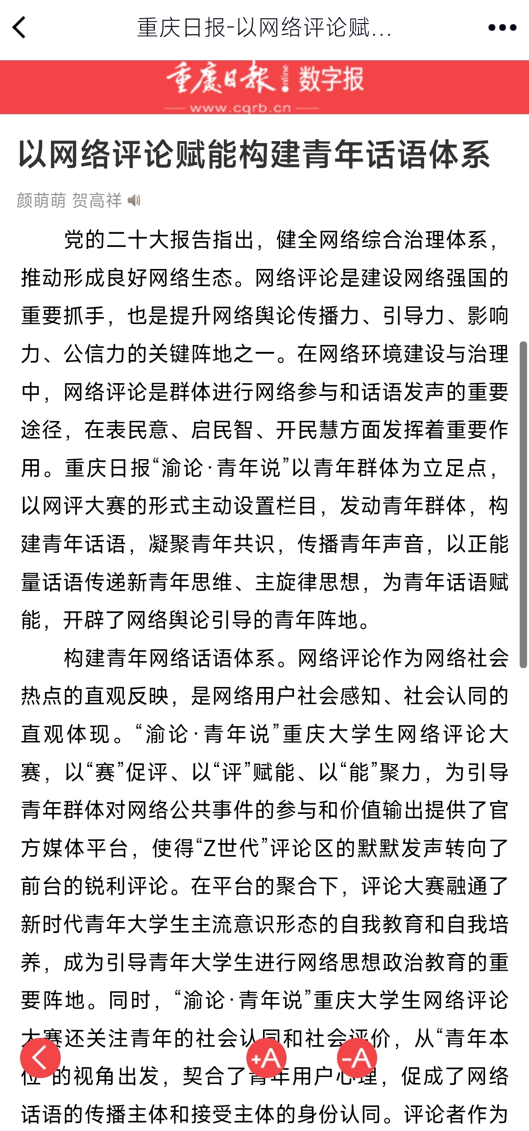 党的二十大报告指出,健全网络综合治理体系,推动形成良好网络生态。网络评论是建设网络强国的重要抓手,也是提升网络舆论传播力、引导力、影响力、公信力的关键阵地之一。在网络环境建设与治理中,网络评论是群体进行网络参与和话语发声的重要途径,在表民意、启民智、开民慧方面发挥着重要作用。重庆日报“渝论.青年说”以青年群体为立足点,以网评大赛的形式主动设置栏目,发动青年群体,构建青年话语,凝聚青年共识,传播青年声音,以正能量话语传递新青年思维、主旋律思想,为青年话语赋能,开辟了网络舆论引导的青年阵地。