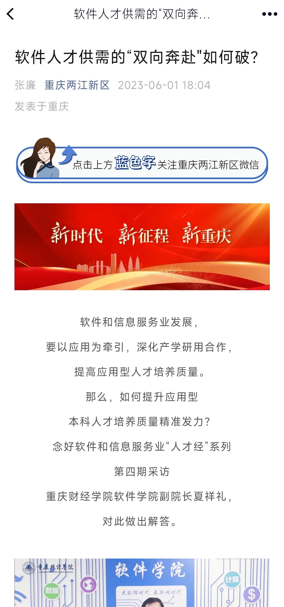 软件和信息服务业是数字经济发展的关键支撑,目前重庆在这一方面人才基础还较为薄弱。为此,夏祥礼建议除了建设完善应用型人才培养体系,加强本土高校人才留渝就业落地外。他表示,还可从优化人才政策,提升人才吸引力;加快软件和信息服务业产业生态建设,为人才提供良好工作和发展空间;加强高校与产业界合作,开展校企合作、人才共享计划等活动;建立成渝地区双城经济圈人才招聘平台,加强人才共享四个方面入手,为软件和信息服务业人才创造良好成长环境,引进全球各地高端人才。