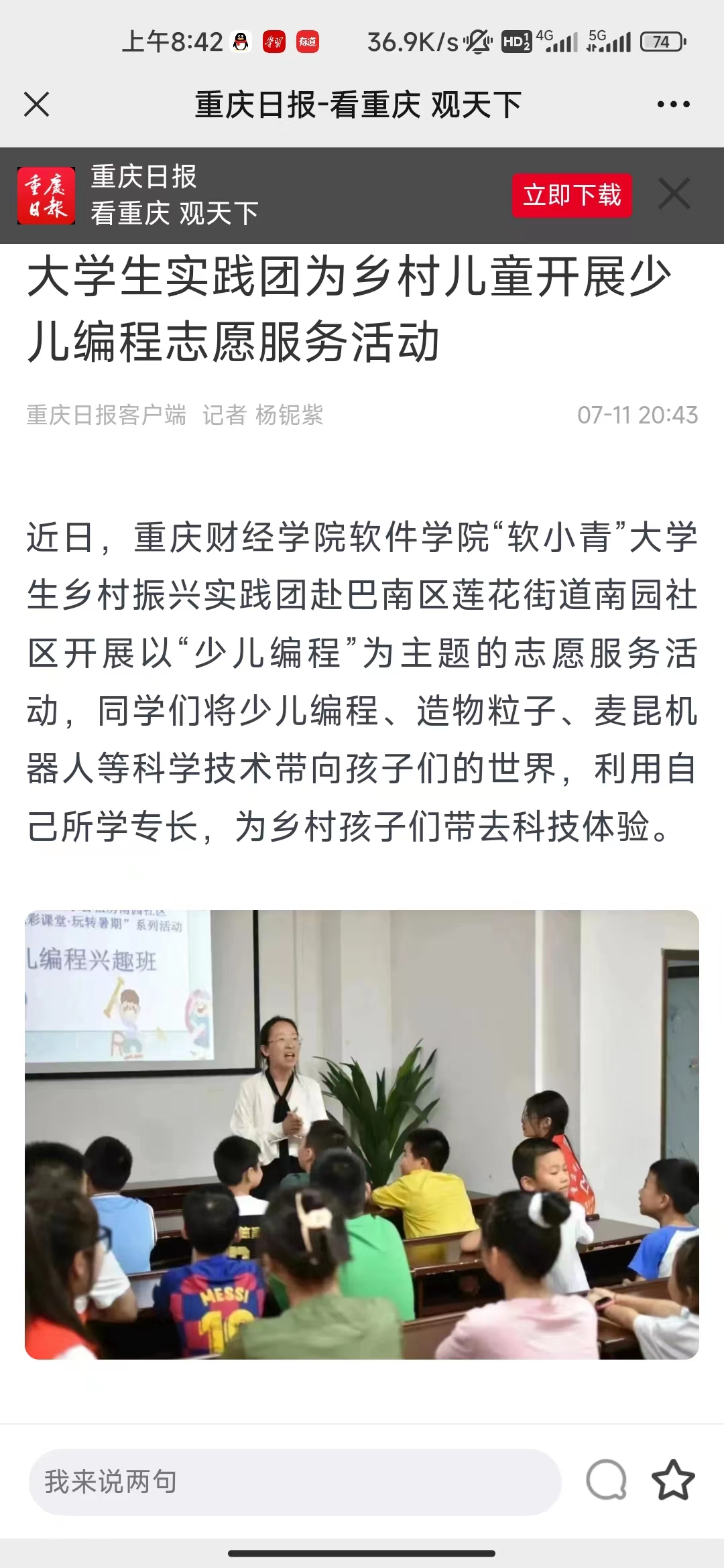 近日,靠谱的电子游戏平台官网软件学院“软小青”大学生乡村振兴实践团赴巴南区莲花街道南园社区开展以“少儿编程”为主题的志愿服务活动,同学们将少儿编程、造物粒子、麦昆机器人等科学技术带向孩子们的世界,利用自己所学专长,为乡村孩子们带去科技体验。
