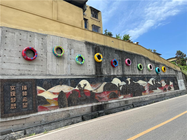 经过志愿者们的巧手绘画,200多个废旧轮胎焕然一新。随后,志愿者们进入云篆山,结合各个点位的差异,根据轮胎大小、颜色和图案设计出了不同的造型方案。按照方案,志愿者们陆续将轮胎摆放上墙,为云篆山公路两侧穿上了“新装”。