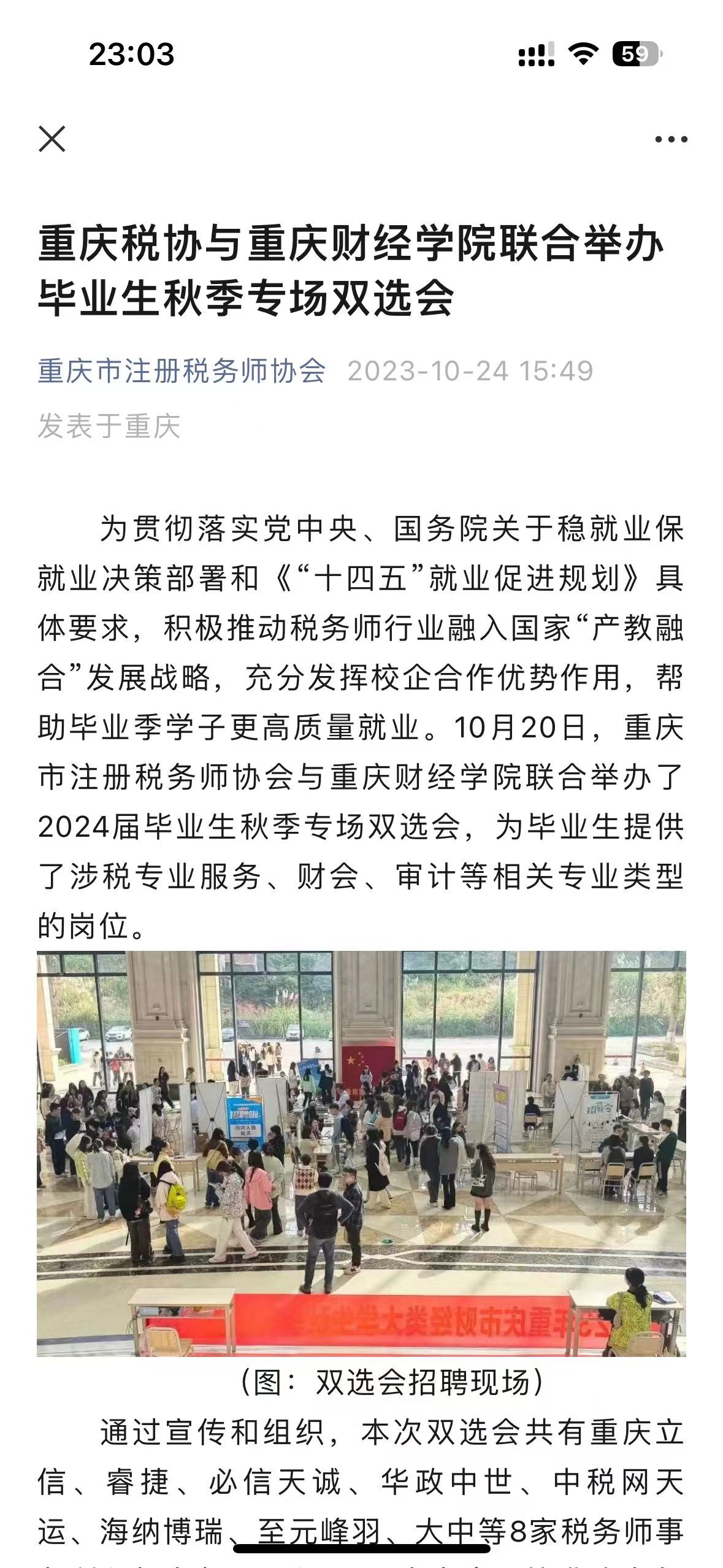 为贯彻落实党中央、国务院关于稳就业保就业决策部署和《“十四五”就业促进规划》具体要求,积极推动税务师行业融入国家“产教融合”发展战略,充分发挥校企合作优势作用,帮助毕业季学子更高质量就业。10月20日,重庆市注册税务师协会与靠谱的电子游戏平台官网联合举办了2024届毕业生秋季专场双选会,为毕业生提供了涉税专业服务、财会、审计等相关专业类型的岗位。