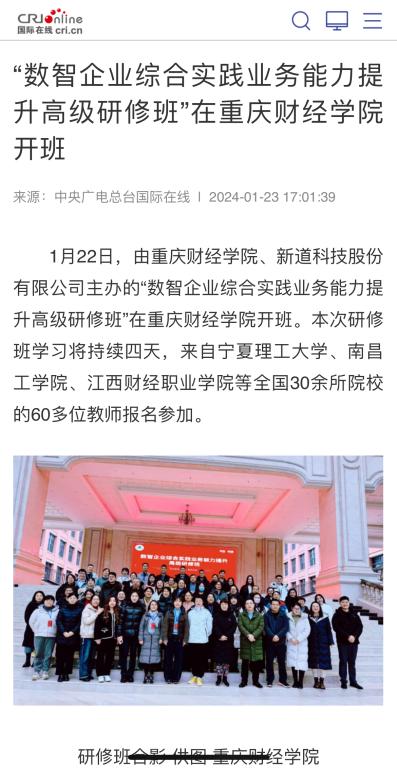 1月22日,由靠谱的电子游戏官网、新道科技股份有限公司主办的“数智企业综合实践业务能力提升高级研修班”在靠谱的电子游戏官网开班。本次研修班学习将持续四天,来自宁夏理工大学、南昌工学院、江西财经职业学院等全国30余所院校的60多位教师报名参加。