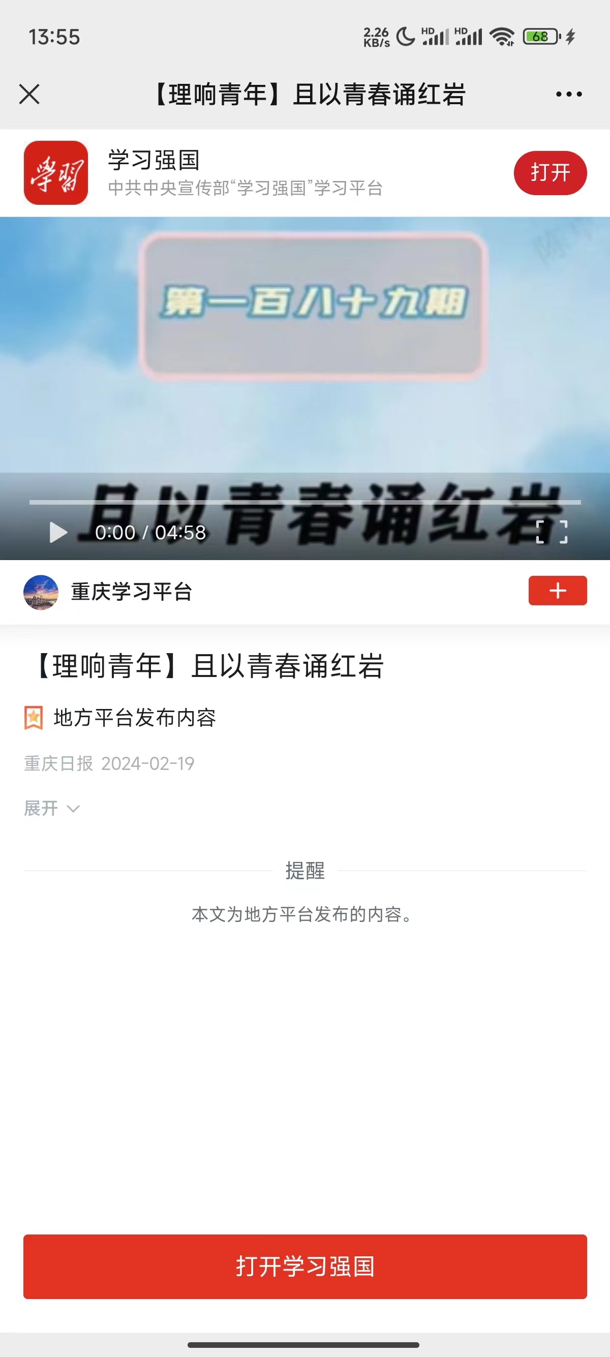 媒体链接:https://article.xuexi.cn/articles/index.html?art_id=1465734378008112812&item_id=1465734378008112812&cdn=https%3A%2F%2Fregion-chongqing-resource&study_style_id=video_default&pid=&ptype=-1&source=share&share_to=wx_single