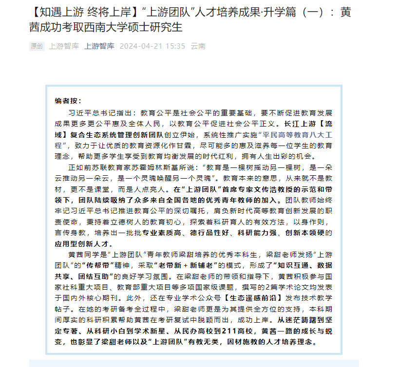 黄茜同学是“上游团队”青年教师梁甜培养的优秀本科生,梁甜老师发扬“上游团队”的“传帮带”精神,采取“老带新+新辅老”的模式,形成了“知识互通、数据共享、团结互助”的良好学习氛围。在梁甜老师的带领和指导下,黄茜积极参与国家社科重大项目、教育部重大项目等多项国家级课题,撰写的2篇学术论文均发表于国内外核心期刊。此外,还在专业学术公众号【生态遥感前沿】发布技术教学帖子。在她的考研备考全过程中,梁甜老师更是为其提供全方位的支持,本科期间厚实的科研积累帮助黄茜在考研复试中脱颖而出,成功上岸。从迷茫踌躇到坚定专著、从科研小白到学术新星、从民办高校到211高校,黄茜一路的成长与蜕变,也彰显了梁甜老师以及“上游团队”有教无类,因材施教的人才培养理念。