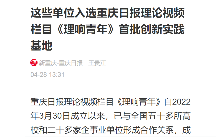 媒体链接:这些单位入选重庆日报理论视频栏目《理响青年》首批创新实践基地 https://wap.cqrb.cn/xcq/NewsDetail?classId=366&newsId=1926391&staticUrl=https%3A%2F%2Ft.cqrb.cn%2Fv6wX