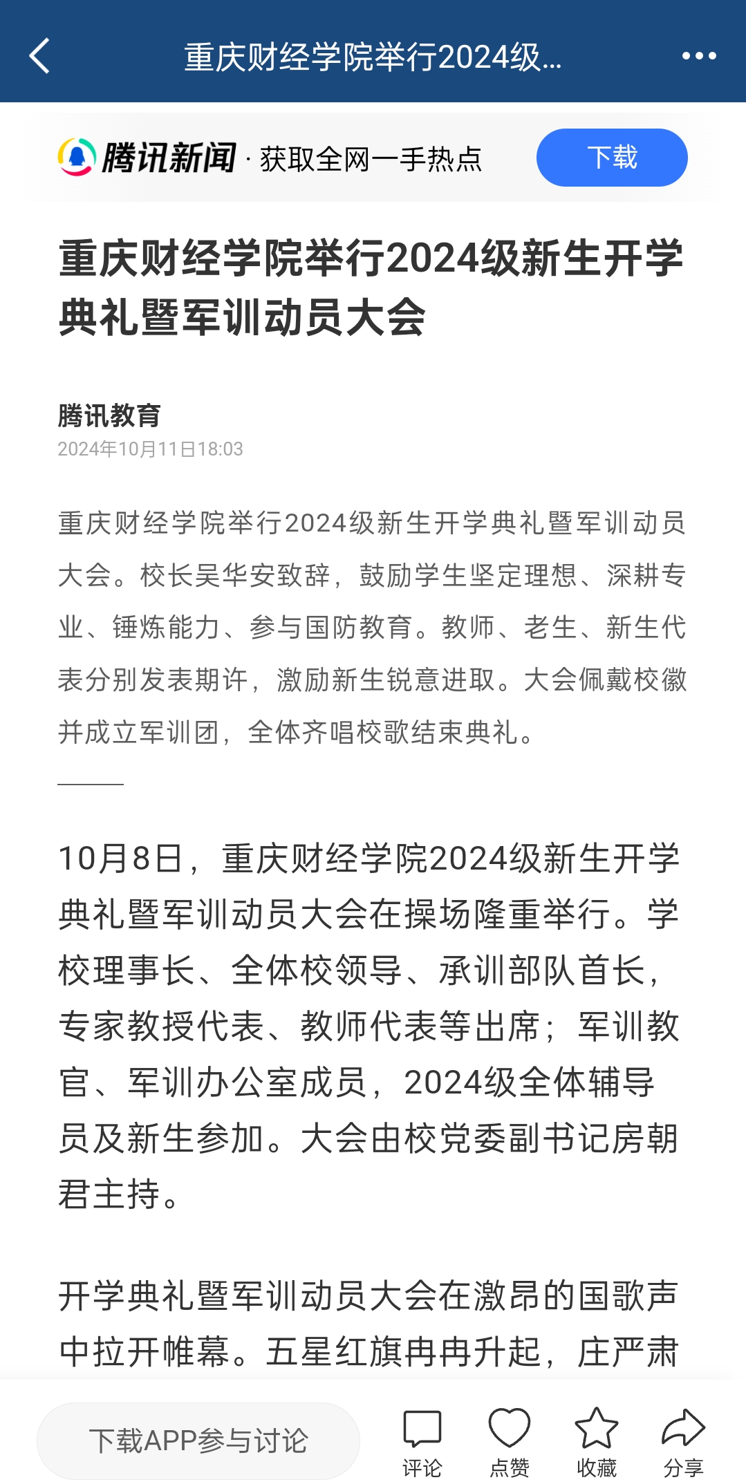四是希望同学们成为国防教育“主力军”,高起点完成军训任务。“强国必重国防情”,加强国防教育,培养具有爱国情怀和国防意识的高素质人才,已成为国家发展的重要战略需求。大学军训,作为国防教育的重要组成部分,不仅是对学生身体素质和纪律性的锻炼,更是培养国防观念、强化国家认同感的重要途径。大家要以此次军训为契机和起点,牢固树立安全第一的意识,严格出勤、认真参训,在提升身体素质、认真完成各项任务的同时,切实增强国防意识和爱国情怀,成为国防的坚强后备力量。上上个月,8 月 29 日,国防部的抖音平台“国防部发布”正式上线,点赞近 1000 万。正如吴谦大校所言:“与大家一起,抖出满满正能量”,新时代的青春气息扑面而来,大家也要与时俱进,不断提升新媒体素养,共同弘扬正能量、唱响主题曲。