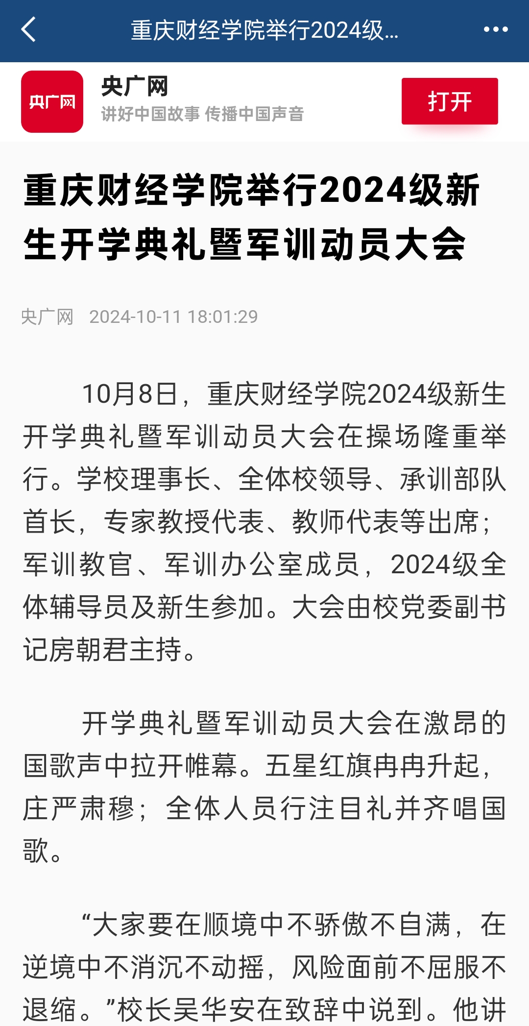 亲爱的2024 级同学们,尊敬的各位专家代表、承训部队教官,老师们: