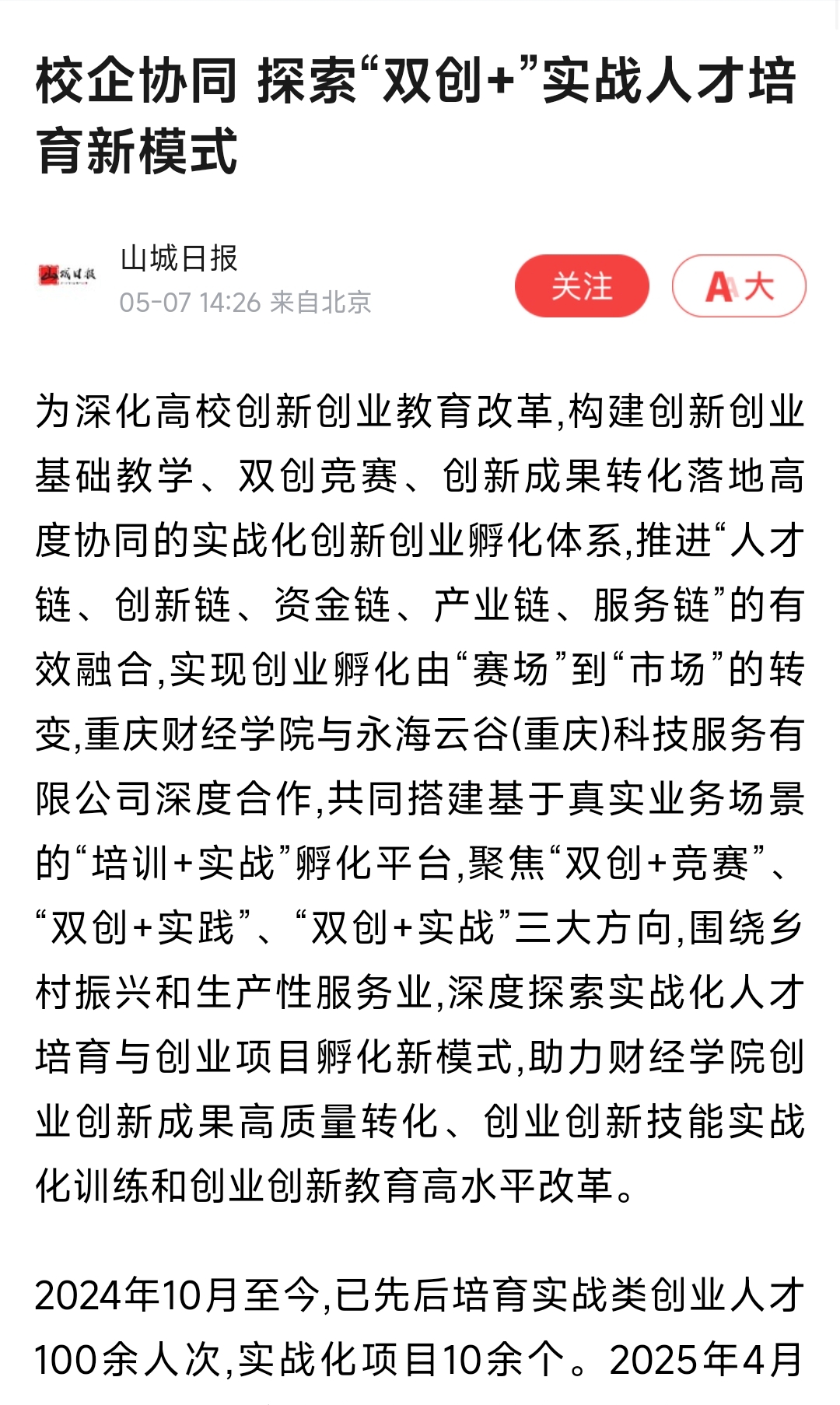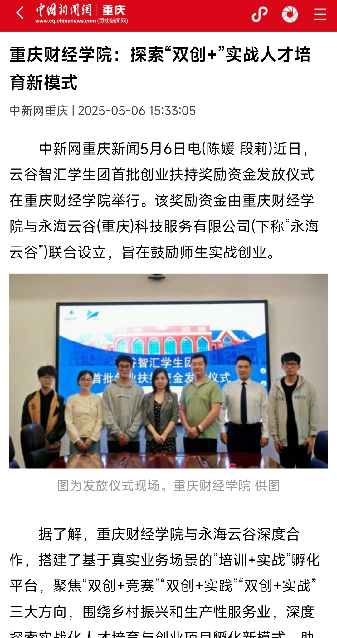 2024年10月至今,已先后培育实战类创业人才100余人次,实战化项目10余个。2025年4月24日,重财教育商学院院长曾真与永海云谷总经理袁嘉云共同为财经学院云谷智汇跨境电商实战创业团队成功发放首批2000元创业扶持奖励资金,鼓励师生实战创业。