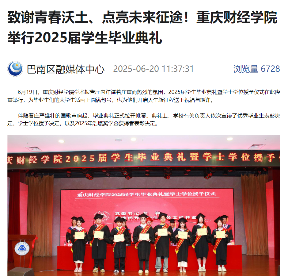 6月19日,靠谱的电子游戏平台官网学术报告厅内洋溢着庄重而热烈的氛围,2025届学生毕业典礼暨学士学位授予仪式在此隆重举行,为毕业生们的大学生活画上圆满句号,也为他们开启人生新征程送上祝福与期许。 伴随着庄严雄壮的国歌声响起,毕业典礼正式拉开帷幕。典礼上,学校有关负责人依次宣读了优秀毕业生表彰决定、学士学位授予决定,以及2025年浩燃奖学金获得者表彰决定。 在热烈的掌声中,校领导为获得学士学位的毕业生代表郑重授予学位并完成拨穗仪式。 仪式结束后,现场响起《再见》的旋律,师生们手牵手共同演唱,歌声响彻云霄,饱含着毕业生对母校的深深眷恋与不舍,更彰显了重财学子们怀揣壮志、奔赴未来的坚定决心。 “我此刻的心情特别激动,也充满感恩。四年来,母校不仅教会了我专业知识,更培养了我独立思考和解决问题的能力。我即将入职上海的一家企业,希望能将所学知识运用到实际工作中,不断提升自己的专业能力。”物联网工程专业毕业生黄帅杰十分不舍地说。 媒体链接: 致谢青春沃土、点亮未来征途!靠谱的电子游戏平台官网举行2025届学生毕业典礼 (cqliving.com) - 搜索 (bing.com) share-kbn.cqliving.com/news-detail-pages/#/newspage/news-page?appId=34&cid=5000384425&time=2025-06-20
