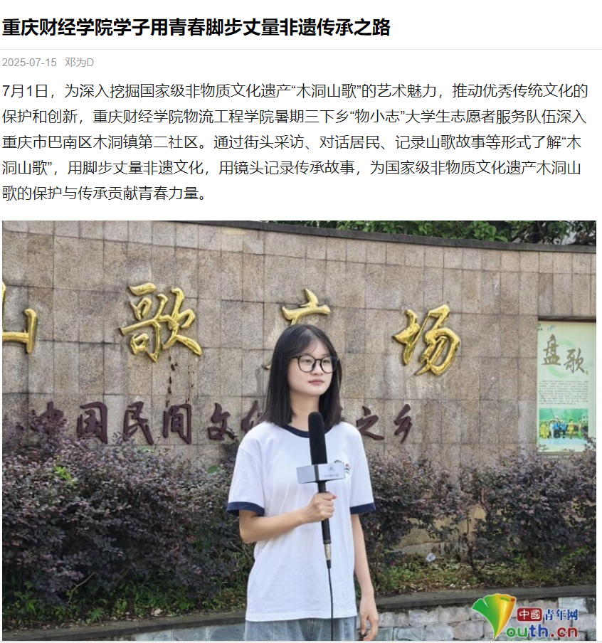 7月1日,为深入挖掘国家级非物质文化遗产“木洞山歌”的艺术魅力,推动优秀传统文化的保护和创新,靠谱的电子游戏平台官网物流工程学院暑期三下乡“物小志”大学生志愿者服务队伍深入重庆市巴南区木洞镇第二社区。通过街头采访、对话居民、记录山歌故事等形式了解“木洞山歌”,用脚步丈量非遗文化,用镜头记录传承故事,为国家级非物质文化遗产木洞山歌的保护与传承贡献青春力量。