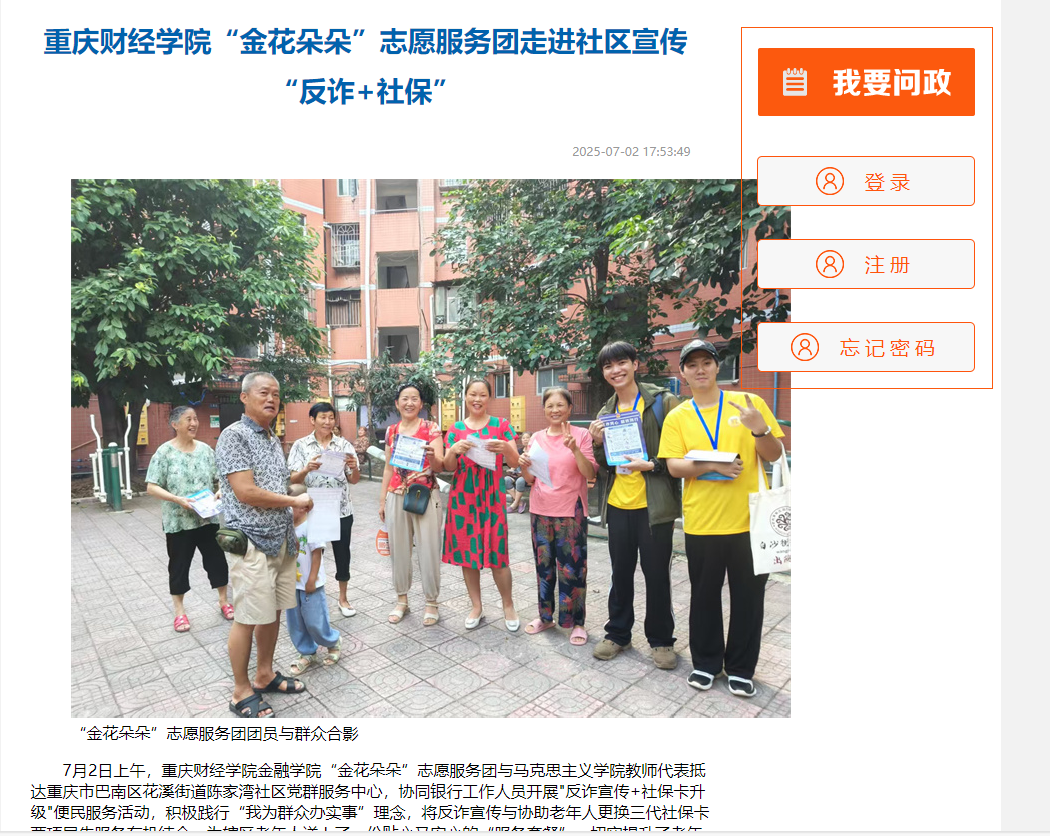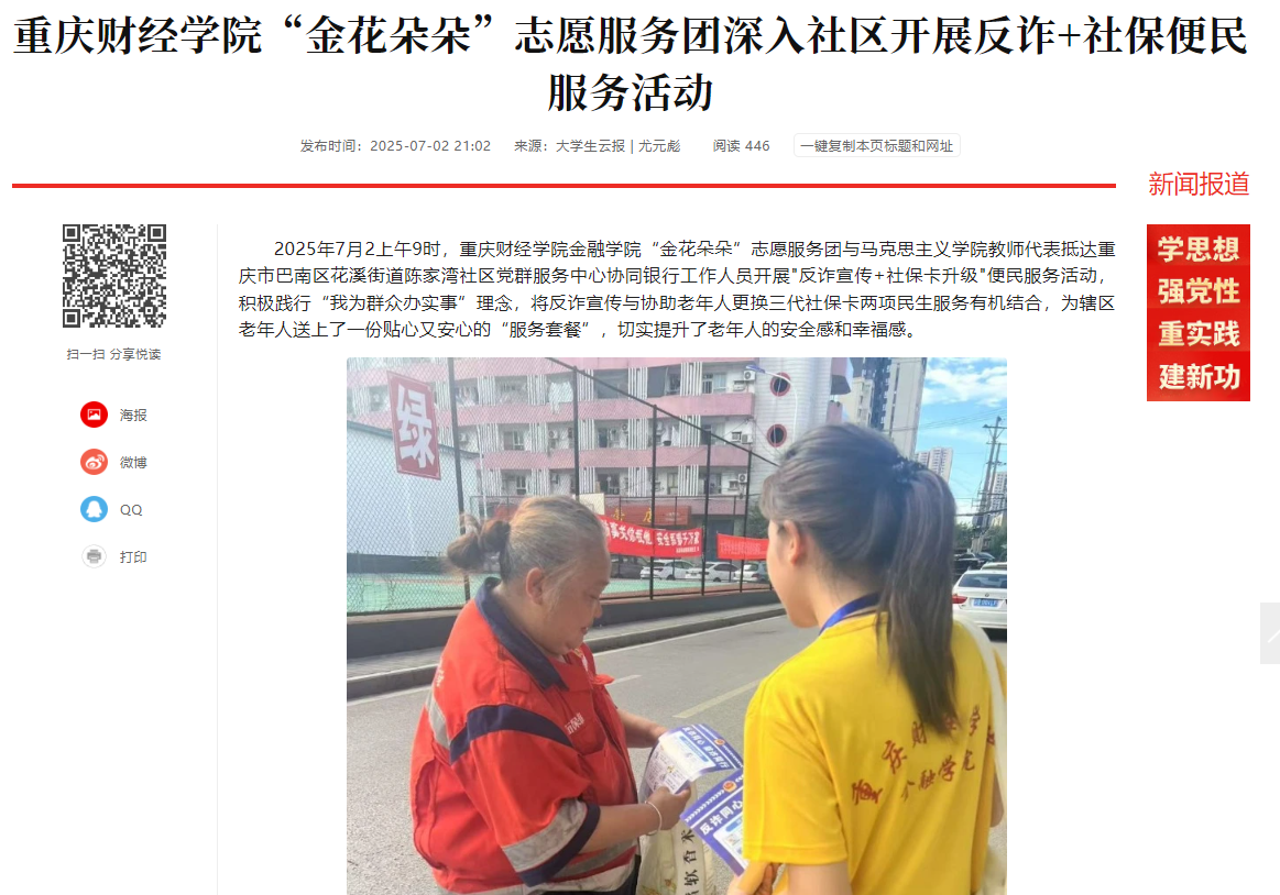 2025年7月2上午9时,靠谱的电子游戏平台官网金融学院“金花朵朵”志愿服务团与马克思主义学院教师代表抵达重庆市巴南区花溪街道陈家湾社区党群服务中心协同银行工作人员开展"反诈宣传+社保卡升级"便民服务活动,积极践行“我为群众办实事”理念,将反诈宣传与协助老年人更换三代社保卡两项民生服务有机结合,为辖区老年人送上了一份贴心又安心的“服务套餐”,切实提升了老年人的安全感和幸福感。