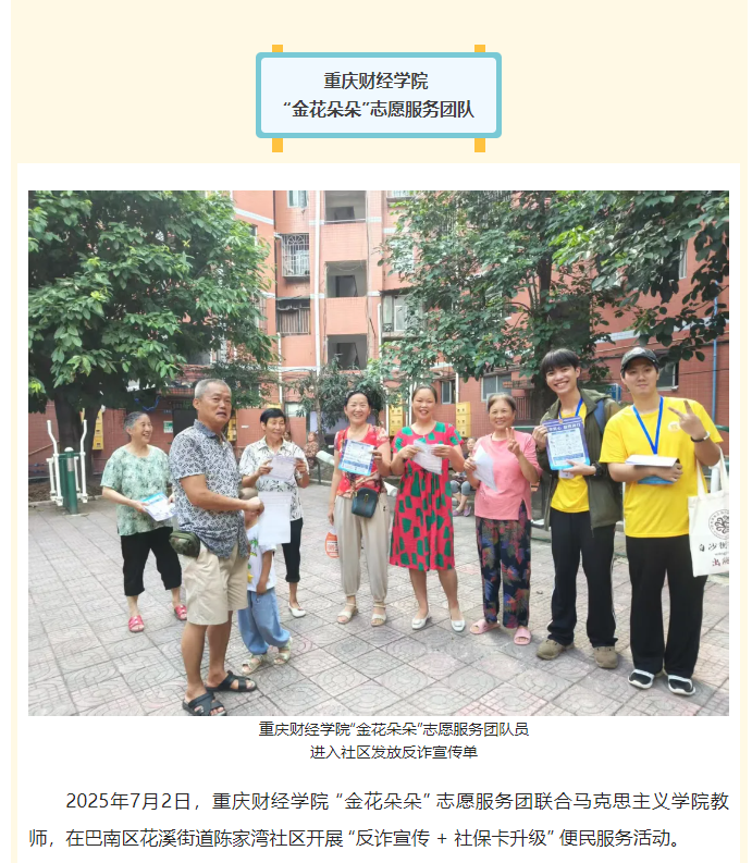 靠谱的电子游戏平台官网“金花朵朵”志愿服务团走进社区宣传“反诈+社保”-重庆网络问政平台 (cqnews.net)