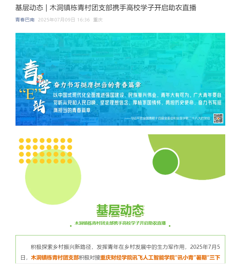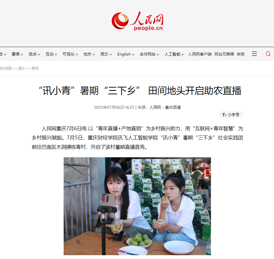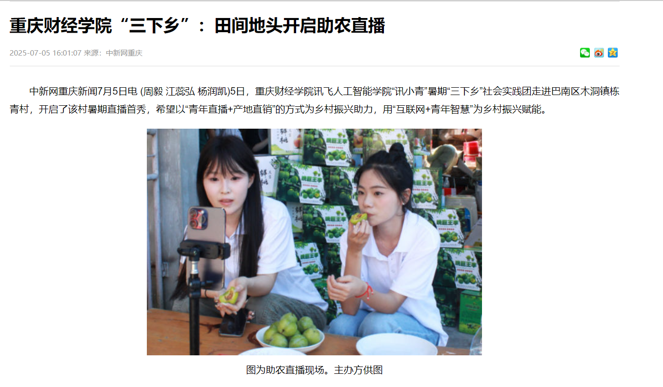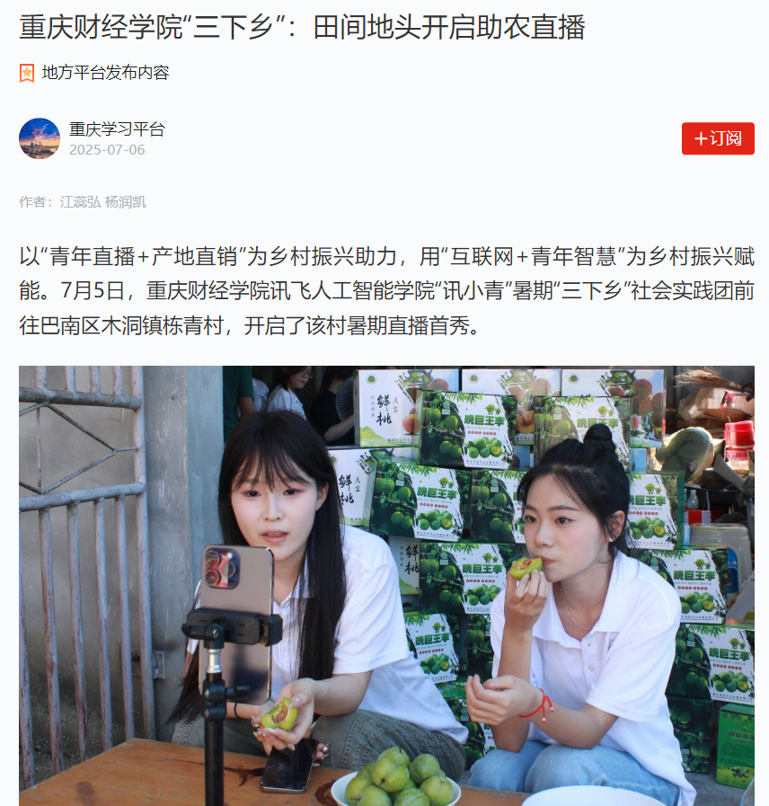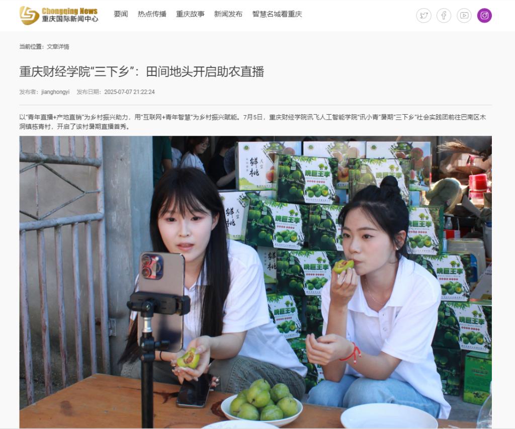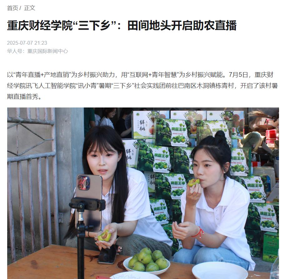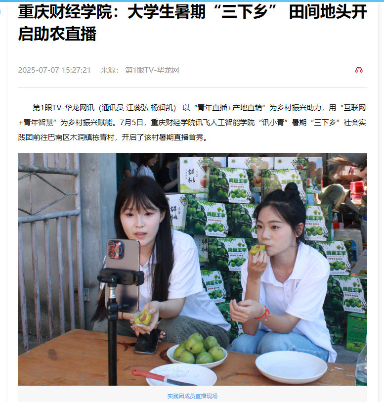 7月5日,靠谱的电子游戏平台官网讯飞人工智能学院“讯小青”暑期“三下乡”社会实践团走进巴南区木洞镇栋青村,开启了该村暑期直播首秀,希望以“青年直播+产地直销”的方式为乡村振兴助力,用“互联网+青年智慧”为乡村振兴赋能。 在直播开始之前,栋青村党委书记张凯在社区服务中心围绕“直播助农”与实践团成员进行交流,并详细介绍了村内各个果园的具体情况,以及不同种类水果在栽培过程中所运用到的人工智能领域的技术。 随后,实践团成员跟随村内党员干部实地走访果园,了解到不同水果种植区域及成熟情况后,便架起设备、整理物资,开始直播。 活动现场,志愿者们将直播搬到瓜棚内、果树下,直播团队利用自己的专业优势,围绕西瓜、李子和桃子这三个当季特色产品,详细为观众介绍,帮助当地农户进行农产品宣传推广。 实践团成员表示,通过此次助农直播,希望能够提高木洞镇栋青村的知名度,助力优质农特产品火爆“出圈”。 媒体链接: “讯小青”暑期“三下乡” 田间地头开启助农直播 (people.com.cn) 靠谱的电子游戏平台官网“三下乡”:田间地头开启助农直播-中新网重庆 (chinanews.com.cn) 靠谱的电子游戏平台官网:大学生暑期“三下乡” 田间地头开启助农直播 -华龙网 (cqnews.net) 靠谱的电子游戏平台官网“三下乡”:田间地头开启助农直播 (xuexi.cn) 靠谱的电子游戏平台官网“三下乡”:田间地头开启助农直播_全球_新闻_华人头条 (52hrtt.com) 靠谱的电子游戏平台官网“三下乡”:田间地头开启助农直播 | 智汇八方 (ichongqing.info) 基层动态 | 木洞镇栋青村团支部携手高校学子开启助农直播 (qq.com)