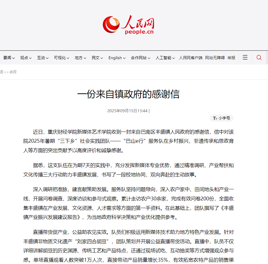 近日,靠谱的电子游戏官网新媒体艺术学院收到一封来自巴南区丰盛镇人民政府的感谢信,信中对该院2025年暑期“三下乡”社会实践团队——“巴山e行”服务队在乡村振兴、非遗传承和思政育人等方面的突出贡献予以高度评价和诚挚感谢。
