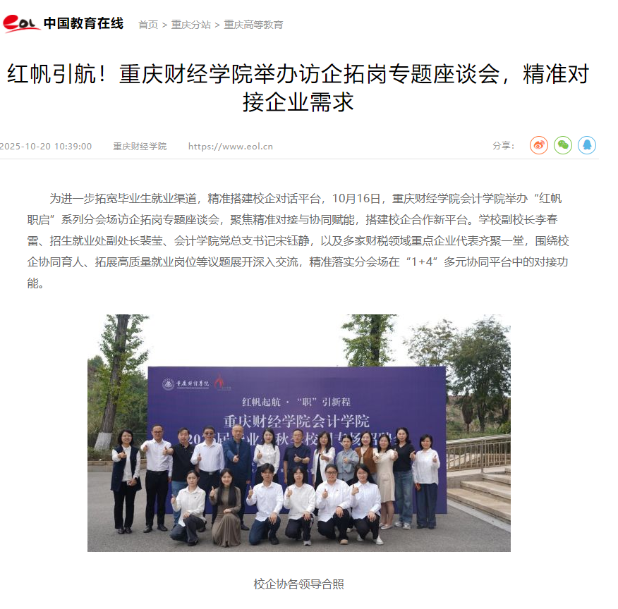 “此次访企拓岗座谈会不是终点,而是校企协同育人的新起点。”学院相关负责人表示,“我们将持续以‘红帆职启’品牌为依托,推动访企拓岗常态化、机制化,既为毕业生开拓更多优质就业路径,也为区域经济发展持续输送适配行业变革的‘新财会’人才。”