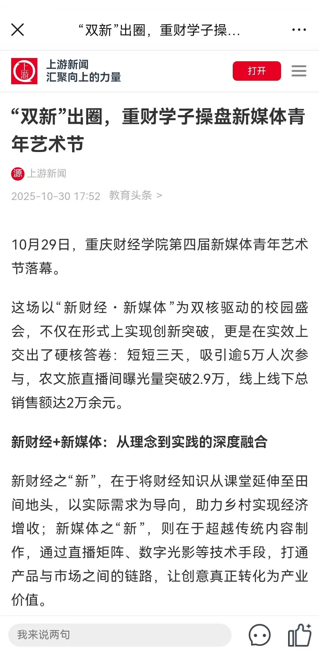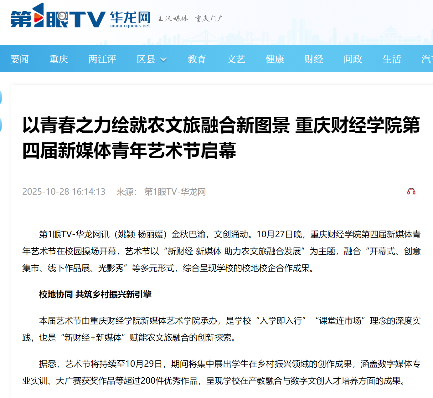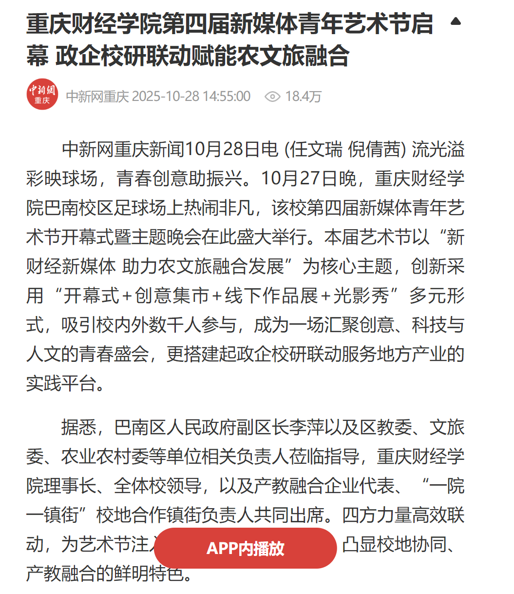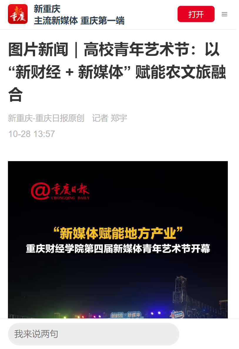 10月27日,靠谱的电子游戏官网第四届新媒体青年艺术节在巴南校区开幕。本届艺术节以“新财经+新媒体”深度融合为特色,为期三天,通过政、校、企、研“四方联动”的创新模式,搭建起一座服务地方农文旅产业发展的“青春桥梁”,展现高校在服务社会与推动产教协同中的积极作为。