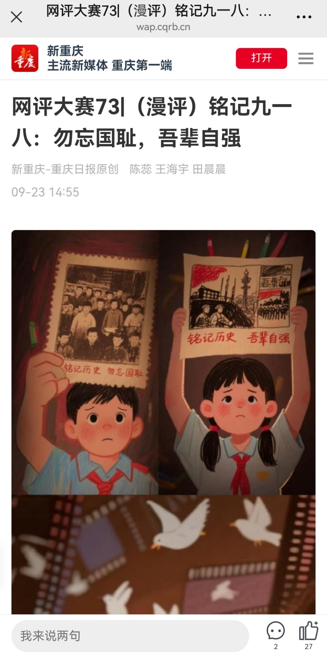 作品简介:画面中,少先队员手持历史资料,凝望历史印记,是对“九一八”国殇的深刻缅怀;白鸽与胶片交织,寓意以史为鉴守护和平;“强国有我”的呐喊,是吾辈自强的铿锵誓言。最后以“勿忘国耻吾辈自强”的标语和握拳图案,跨越1931年到2025年的时光,警示人们铭记九一八事变的历史伤痛,在缅怀先烈、珍视和平的同时,更要肩负起自强报国的时代使命,以史为鉴,振兴中华。 媒体链接:https://wap.cqrb.cn/xcq/NewsDetail?classId=2267&newsId=2422887