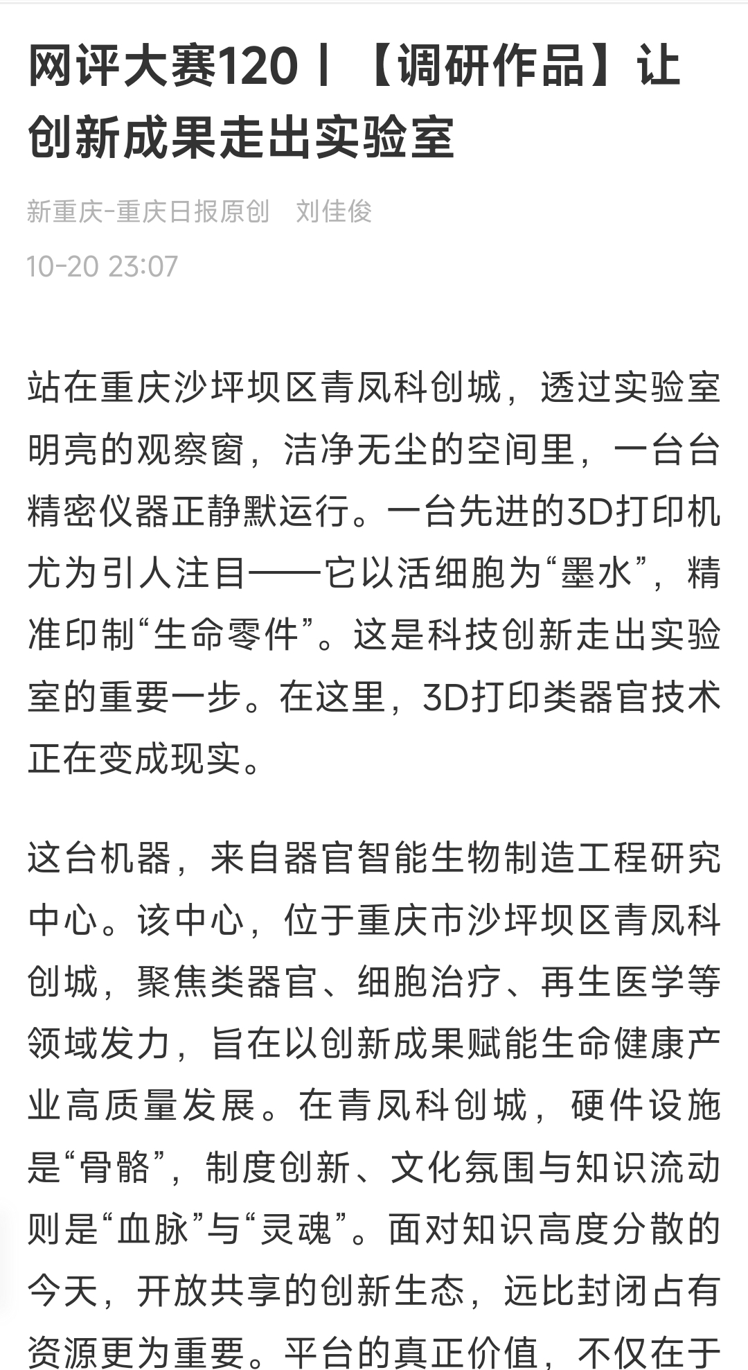这台机器,来自器官智能生物制造工程研究中心。该中心,位于重庆市沙坪坝区青凤科创城,聚焦类器官、细胞治疗、再生医学等领域发力,旨在以创新成果赋能生命健康产业高质量发展。在青凤科创城,硬件设施是“骨骼”,制度创新、文化氛围与知识流动则是“血脉”与“灵魂”。面对知识高度分散的今天,开放共享的创新生态,远比封闭占有资源更为重要。平台的真正价值,不仅在于设施完善,更在于创造无限连接、激发思想奔涌——这正是现代产业决胜未来的关键所在。