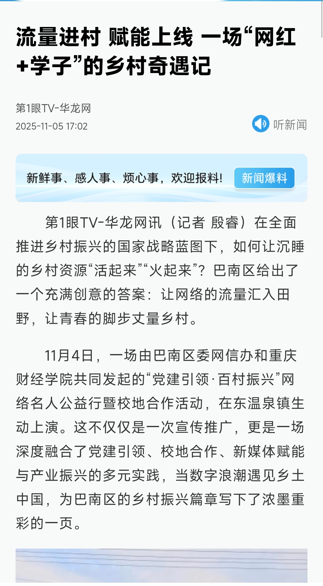 第1眼TV-华龙网讯(记者 殷睿)在全面推进乡村振兴的国家战略蓝图下,如何让沉睡的乡村资源“活起来”“火起来”?巴南区给出了一个充满创意的答案:让网络的流量汇入田野,让青春的脚步丈量乡村。