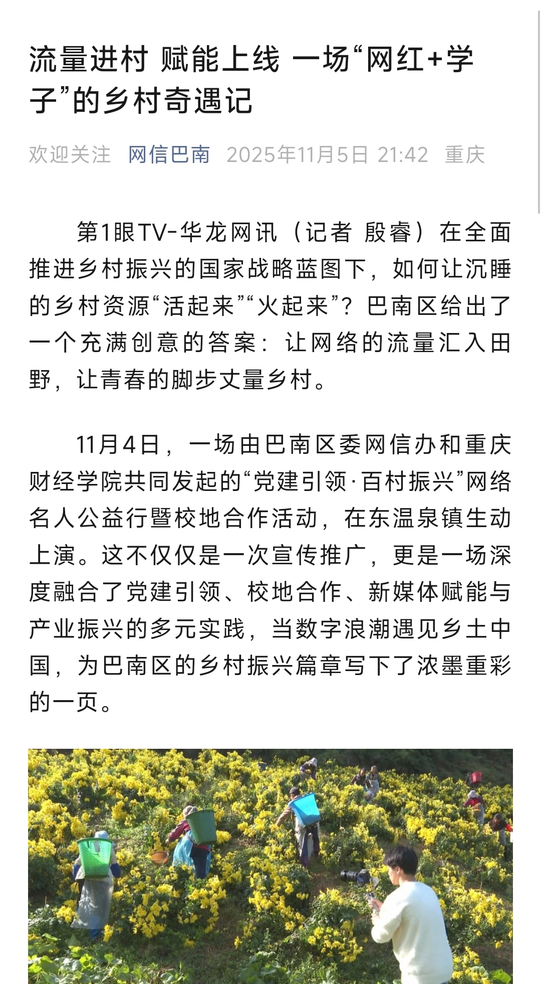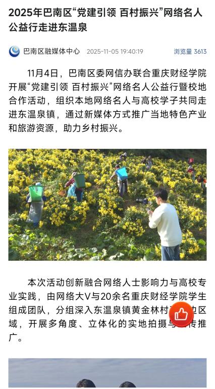 11月4日,一场由巴南区委网信办和靠谱的电子游戏平台官网共同发起的“党建引领·百村振兴”网络名人公益行暨校地合作活动,在东温泉镇生动上演。这不仅仅是一次宣传推广,更是一场深度融合了党建引领、校地合作、新媒体赋能与产业振兴的多元实践,当数字浪潮遇见乡土中国,为巴南区的乡村振兴篇章写下了浓墨重彩的一页。