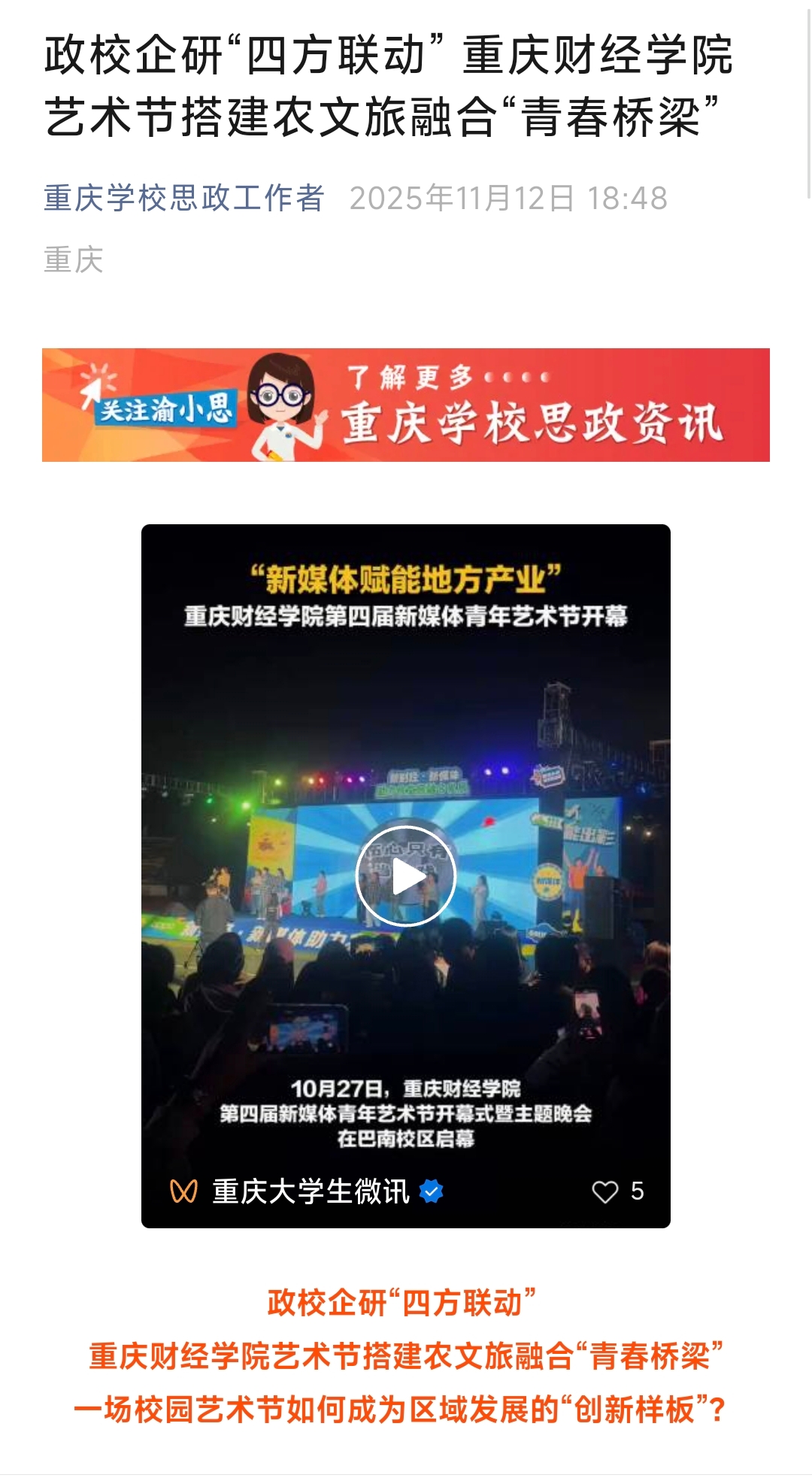 本届艺术节的成功,其意义远超活动本身。它系统地验证了一种高校深度融入地方发展、实现多方共赢的可操作路径。这个“重财样本”表明,在“新财经”与“新媒体”的交汇点上,高校完全可以从区域经济发展的“旁观者”或“后备军”,转变为积极的“参与者”和“创新引擎”。