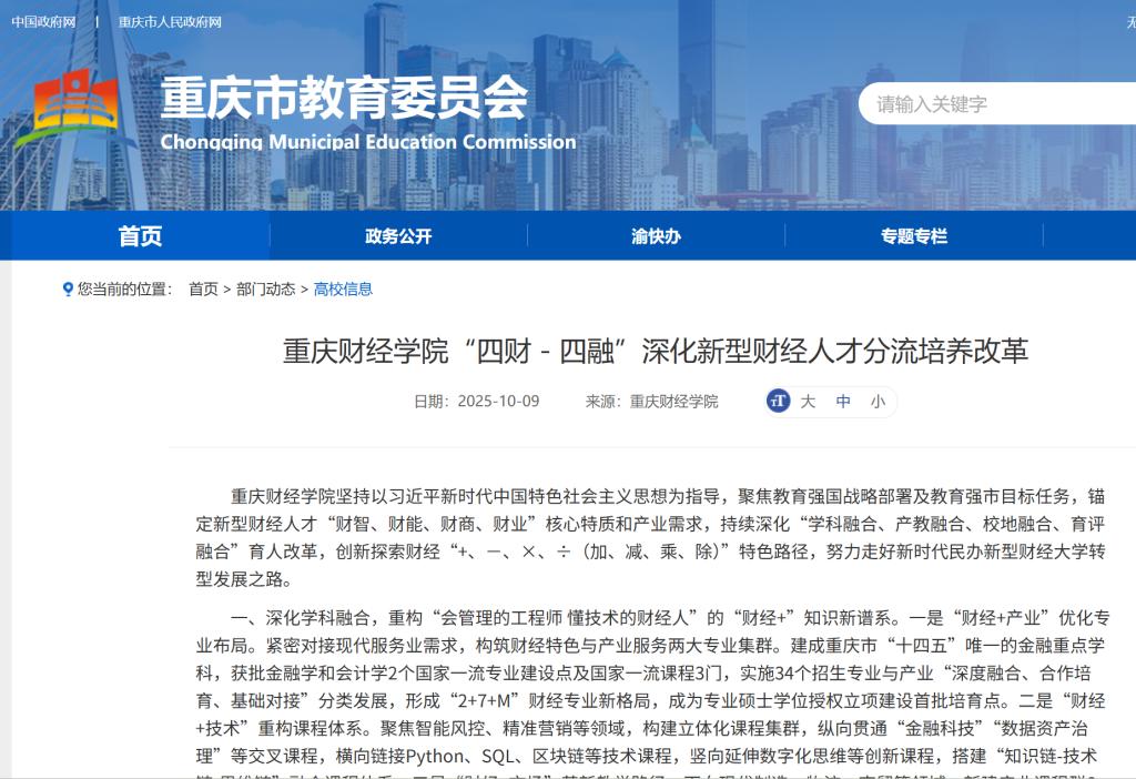 一、深化学科融合,重构“会管理的工程师 懂技术的财经人”的“财经+”知识新谱系。一是“财经+产业”优化专业布局。紧密对接现代服务业需求,构筑财经特色与产业服务两大专业集群。建成重庆市“十四五”唯一的金融重点学科,获批金融学和会计学2个国家一流专业建设点及国家一流课程3门,实施34个招生专业与产业“深度融合、合作培育、基础对接”分类发展,形成“2+7+M”财经专业新格局,成为专业硕士学位授权立项建设首批培育点。二是“财经+技术”重构课程体系。聚焦智能风控、精准营销等领域,构建立体化课程集群,纵向贯通“金融科技”“数据资产治理”等交叉课程,横向链接Python、SQL、区块链等技术课程,竖向延伸数字化思维等创新课程,搭建“知识链-技术链-思维链”融合课程体系。三是“财经+市场”革新教学路径。面向现代制造、物流、商贸等领域,新建产业课程群6个,开发“案例库+数据集+仿真平台”教学包,构建“线上虚拟仿真-线下场景课堂-企业实地调研”三轨教学场景。校企共建课程235门、案例库189个、虚拟实验106项、教材资源36项、数据库15个,广泛开展分层跨学科联合教学。