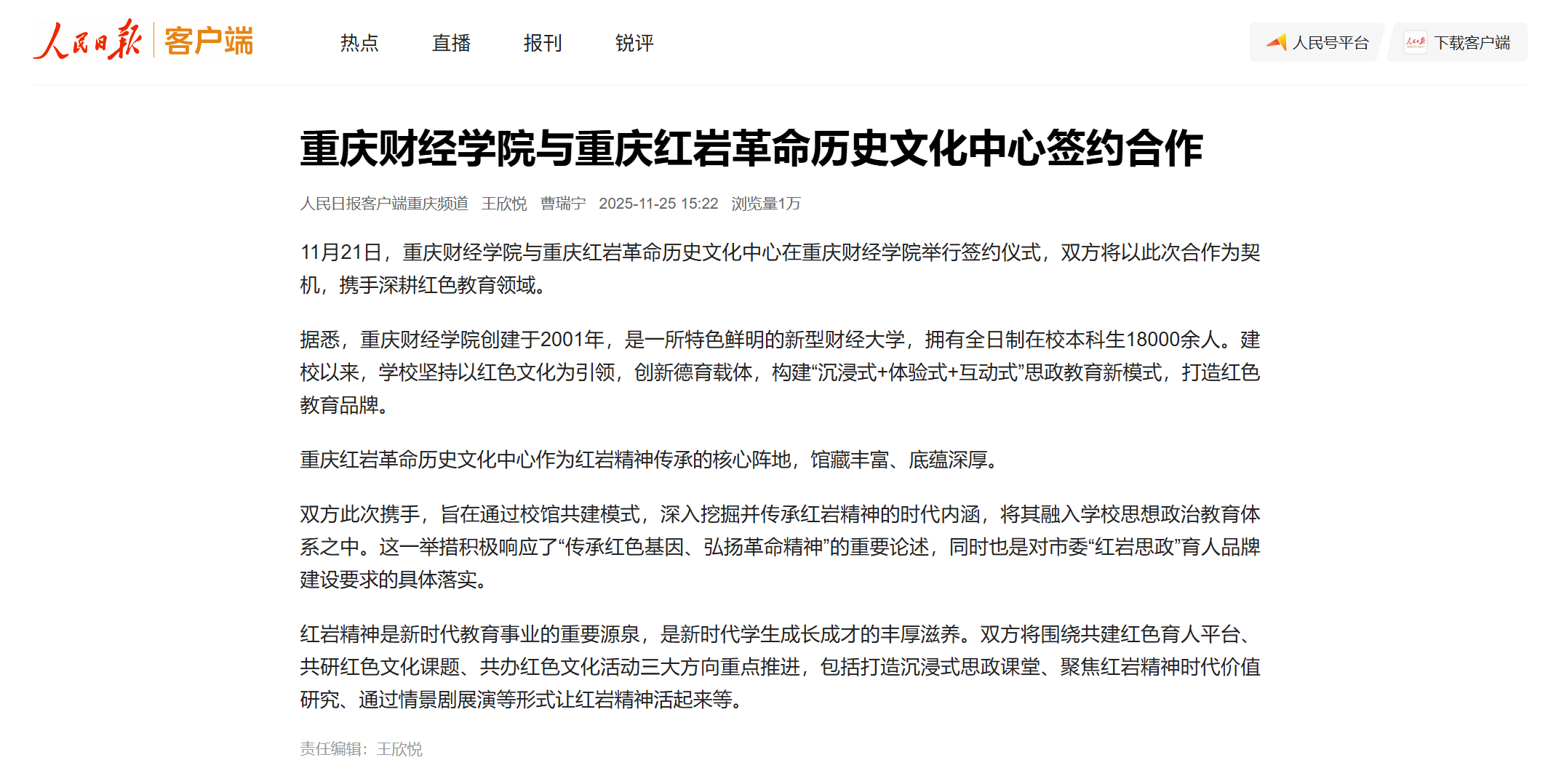 11月21日,靠谱的电子游戏官网与重庆红岩革命历史文化中心在靠谱的电子游戏官网举行签约仪式,双方将以此次合作为契机,携手深耕红色教育领域。